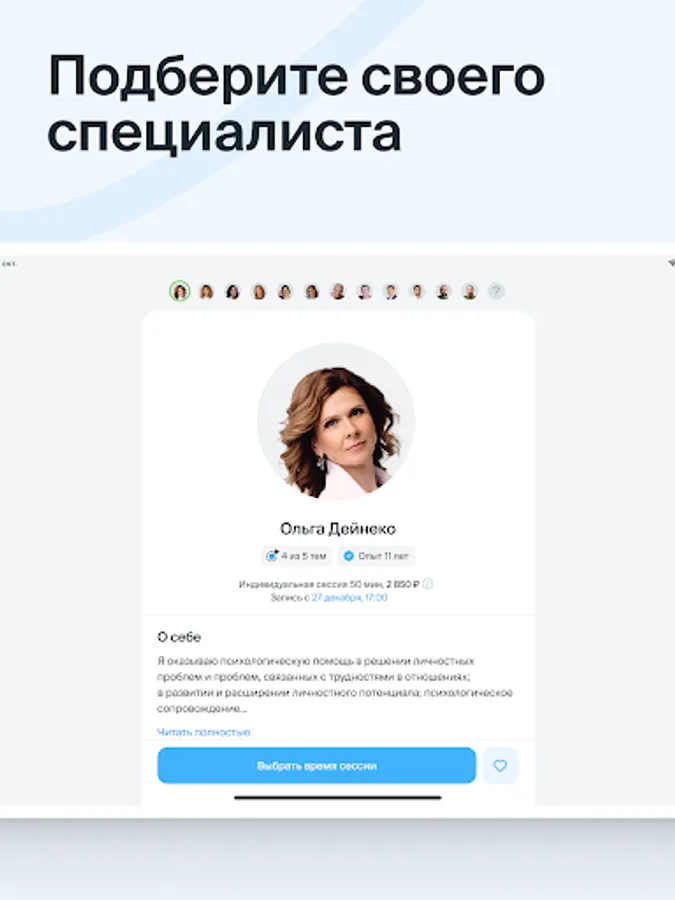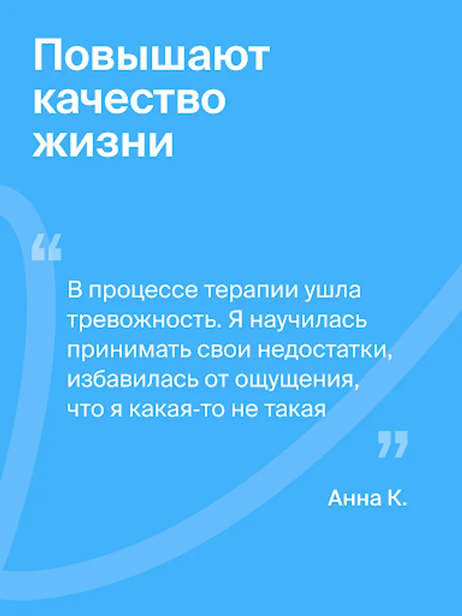 We carefully select specialists: they all have a higher specialized education, consulting experience of at least three years, and regularly undergo supervision on our service. In addition, we interview each psychologist to make sure that he is pleasant and adequate.