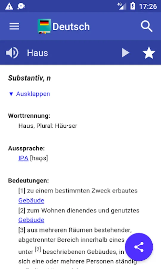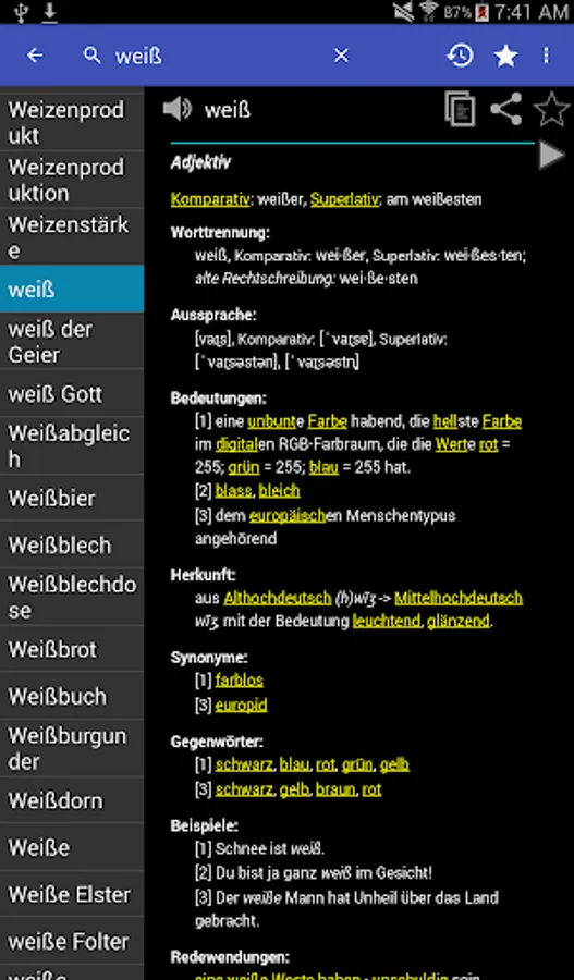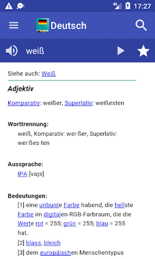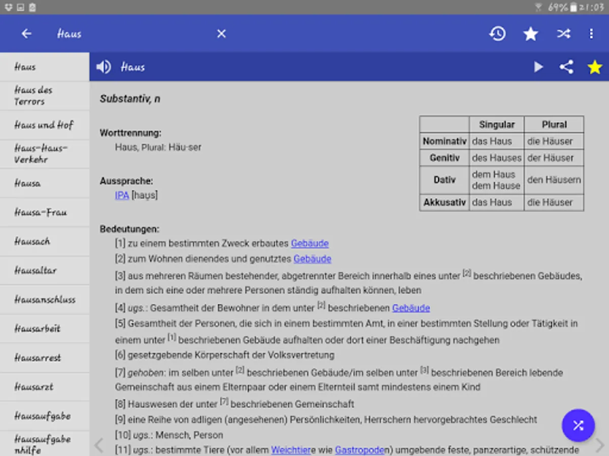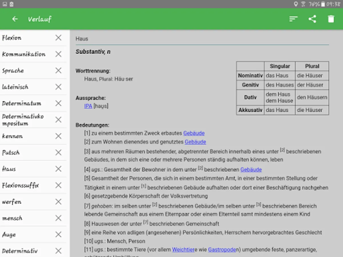 The free offline German dictionary application explains the meaning of German words! Definitions are based on German Wiktionary. This is a monolingual German dictionary: words must be entered in German language.