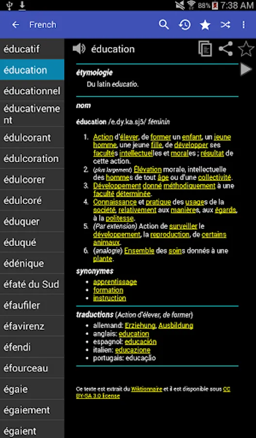 The French dictionary explains the meaning of French words, based on French Wiktionary. This is a monolingual French dictionary: words must be entered in French.