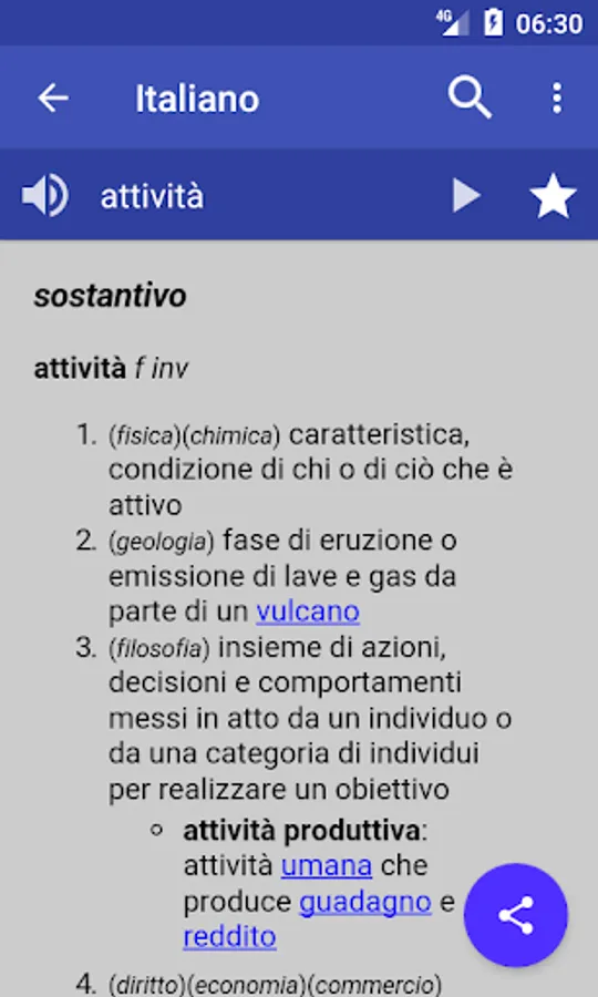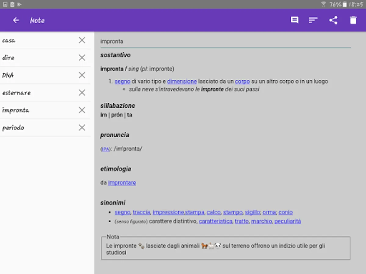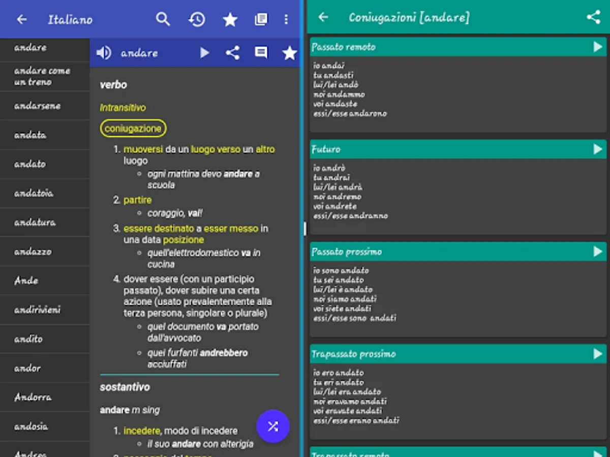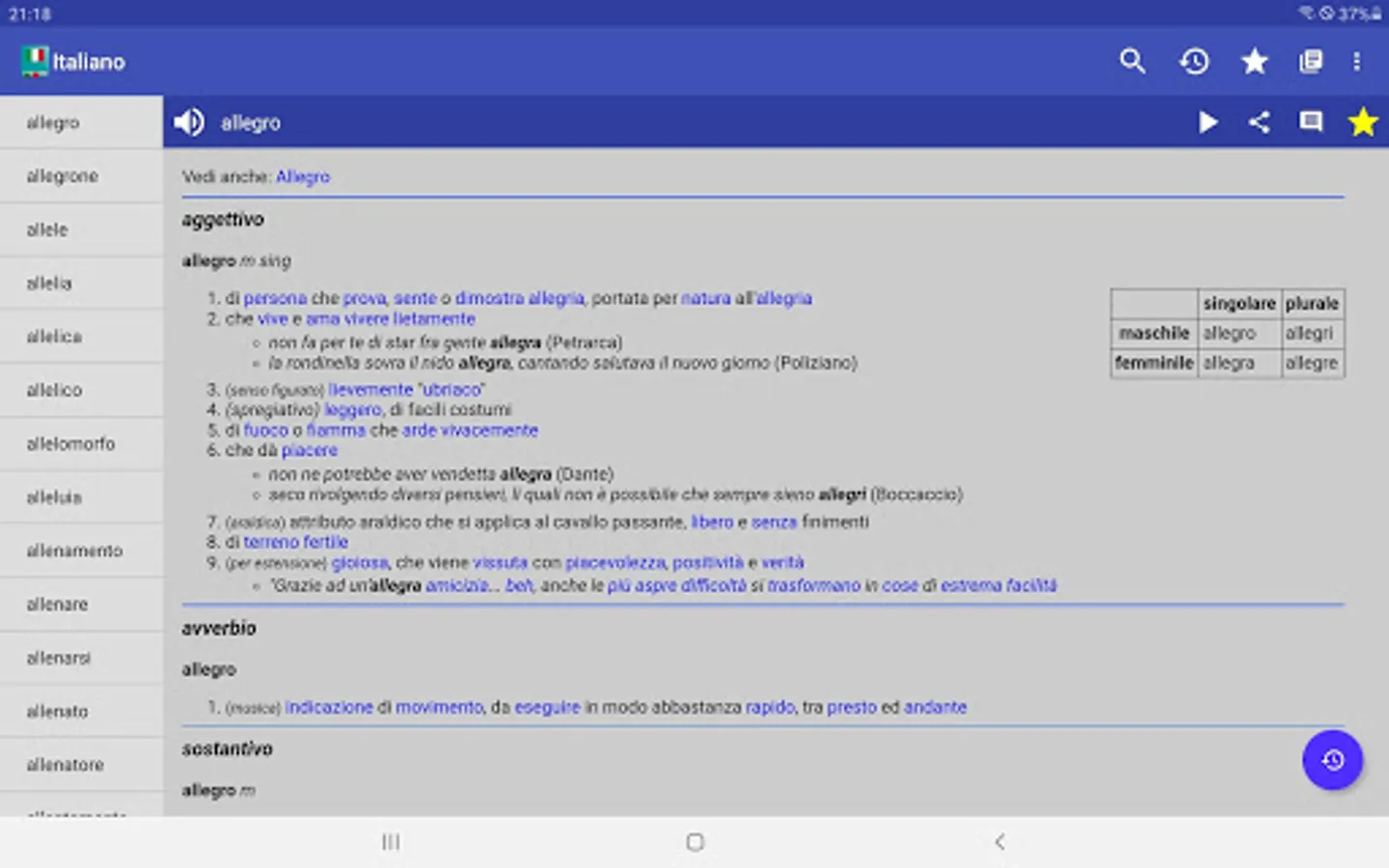This free offline Italian dictionary application explains the meaning of Italian words, based on Italian Wiktionary. This is a monolingual dictionary only in Italian, i.e. words must be entered in Italian. Warning: lot of words are missing due to the italian Wiktionary's incompleteness.