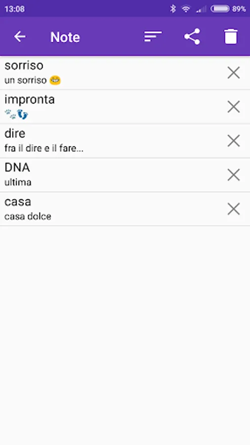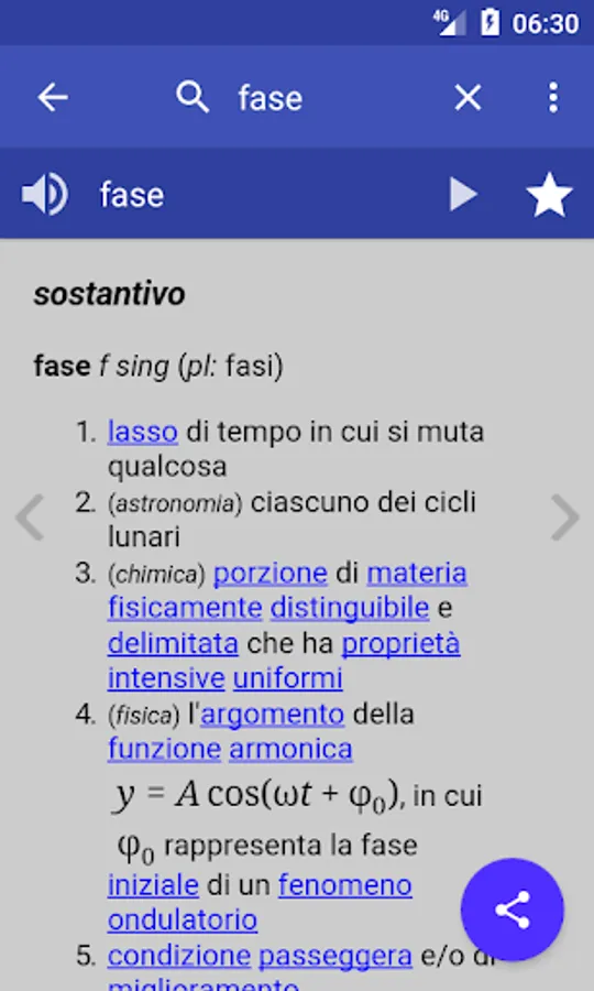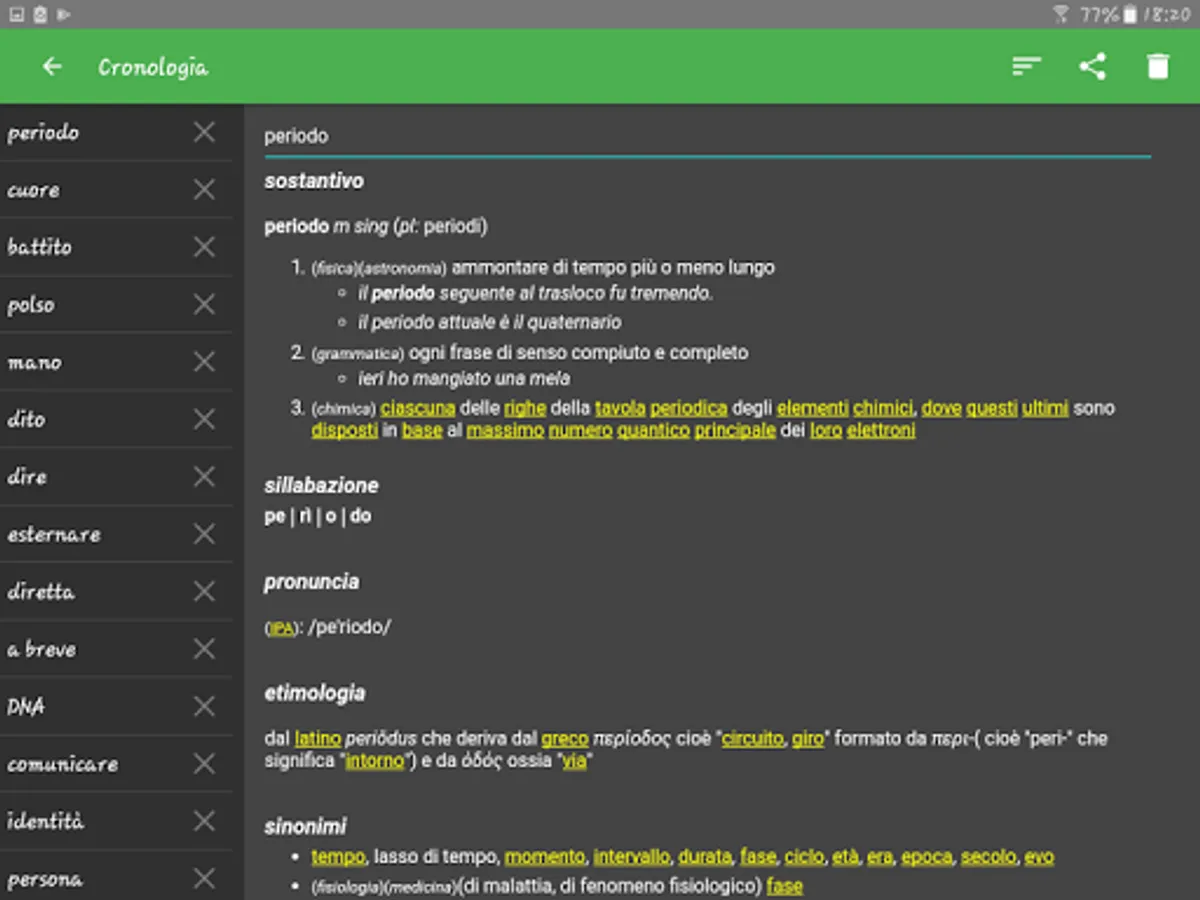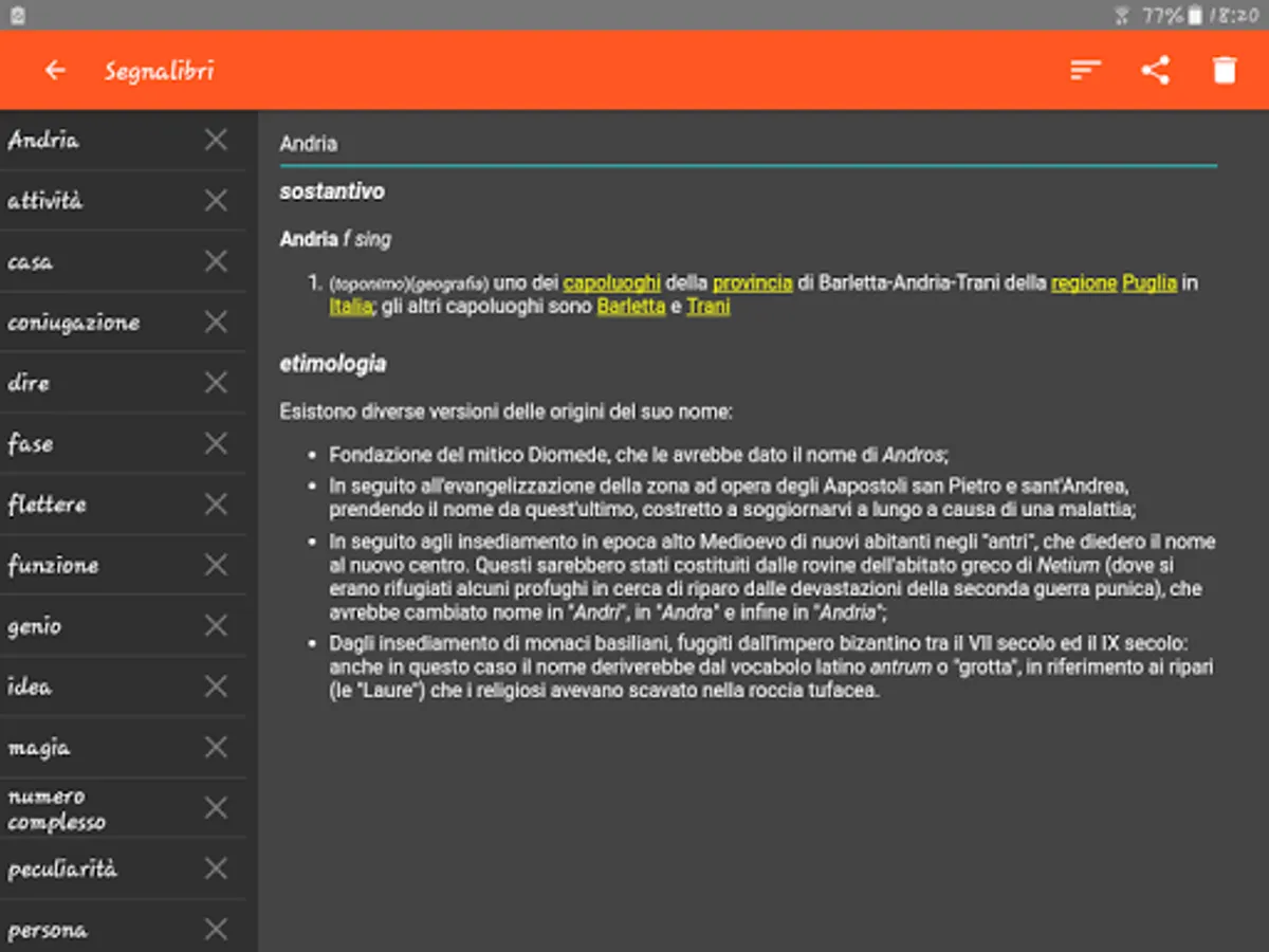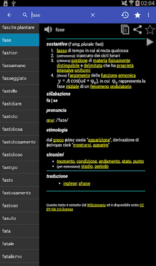 This free offline Italian dictionary application explains the meaning of Italian words, based on Italian Wiktionary. This is a monolingual dictionary only in Italian, i.e. words must be entered in Italian. Warning: lot of words are missing due to the italian Wiktionary's incompleteness.