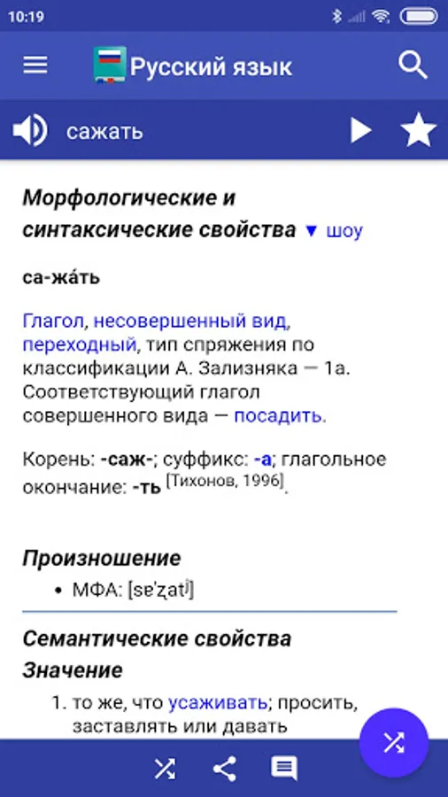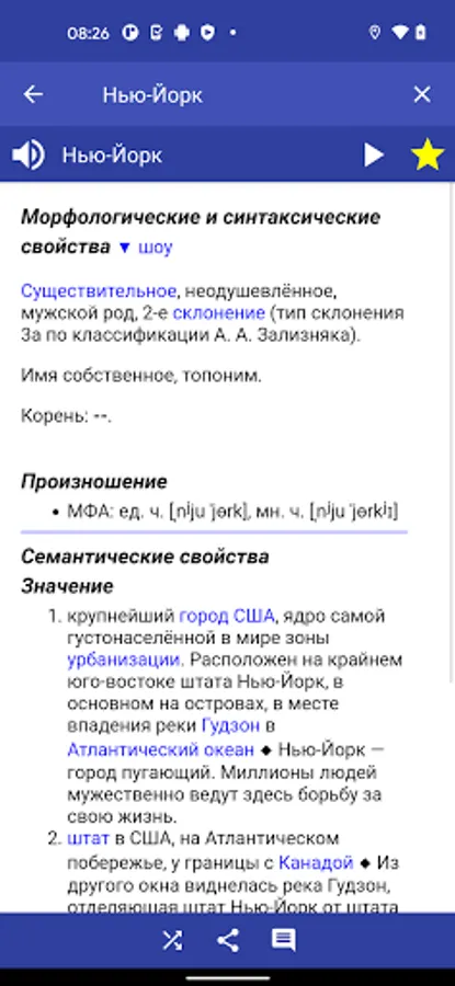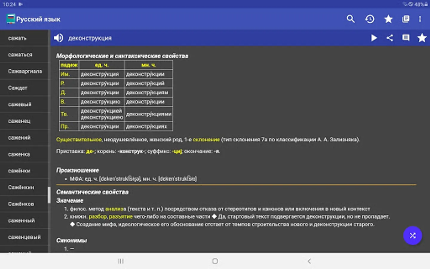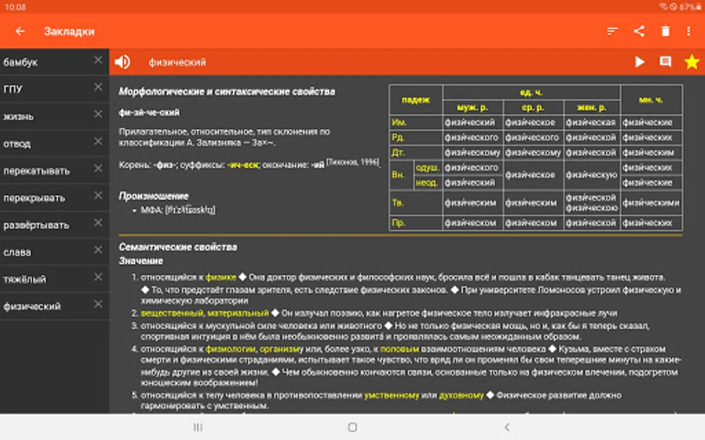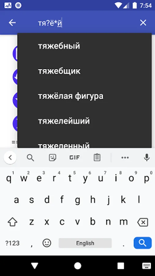 ♦ Automatic transliteration of Latin alphabet into Cyrillic alphabet, e.g. if you type 'mehanizm', the app will find 'механизм'