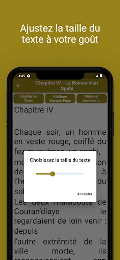 Our app was designed to meet your reading needs, even when you don't have an internet connection. You can immerse yourself in the world of 'Le Roman d'un Spahi' anywhere, whether you are in the metro, on a secluded beach or in the tranquility of your room.