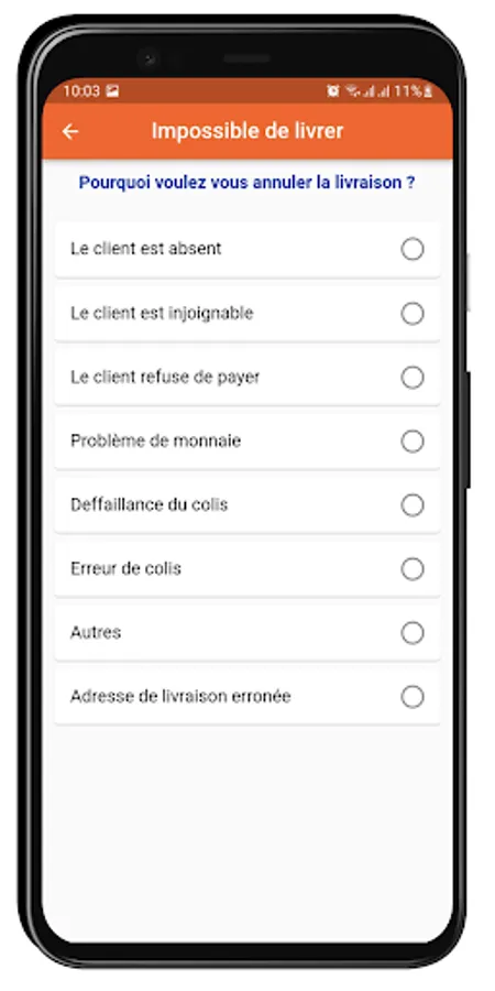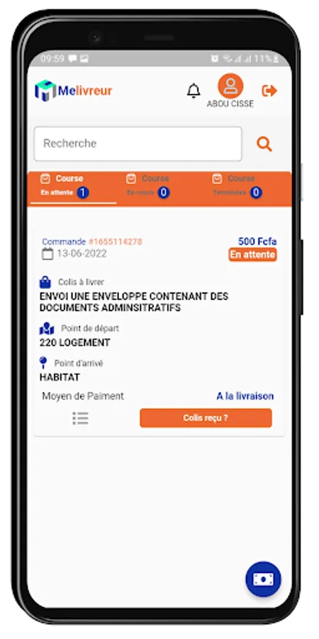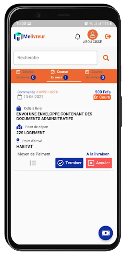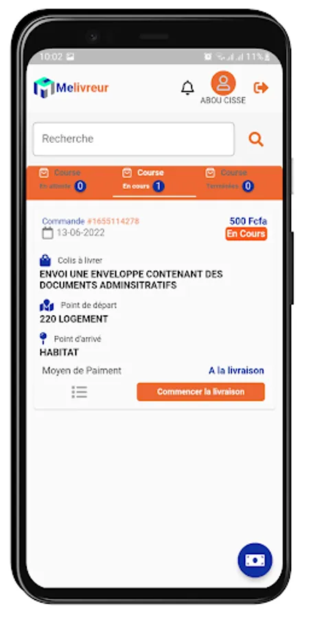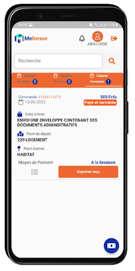 Delivery management application. It allows the delivery person to see his order list, accept, refuse an order. It also allows the delivery person to see his fees