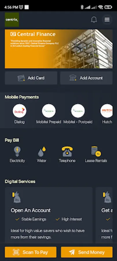 “Centrix” is a digital (FinTech) Payment App powered by Central Finance Company PLC. Download the Centrix app for bank to bank money transfer via JustPay and CEFT & instantly, pay at shops (merchant locations) using LankaQR and make your bill payments with ease and conveniently. Use Centrix for mobile recharge, Postpaid bill payment, Utility bill payment such as Water, Electricity, Landline, Broadband and insurance. All transactions effortlessly perform in a few clicks.
