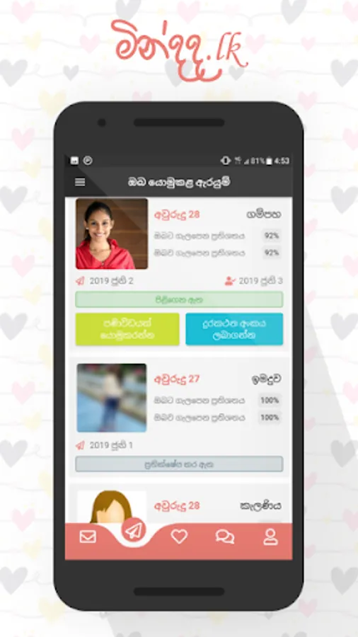 ඔබේ ගිණුම සම්පුර්ණ කිරීමෙන් අනතුරුව ඔබ ලබාදුන් විස්තර වලට අනුකුල යෝජනා "ගැලපෙන යෝජනා" පිටුවේ පෙන්වන අතර වැඩි විස්තර "ගිණුම" button එක click කිරීමෙන් බලාගන්න පුළුවන්. ඊට අමතරව ඔබ සහ අදාළ සහකරු අතර ගැලපීම බලාගැනීමට "ගැලපීම" button එක click කරන්න. ඇරයුම් කරන්න button එක click කිරීම මගින් අදාල සහකරුට ඇරයුමක් යවන්න පුළුවන්.