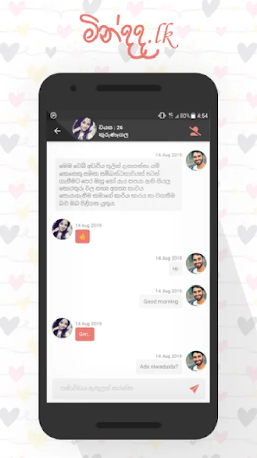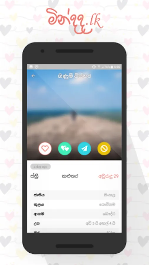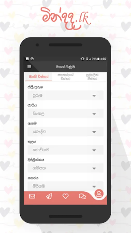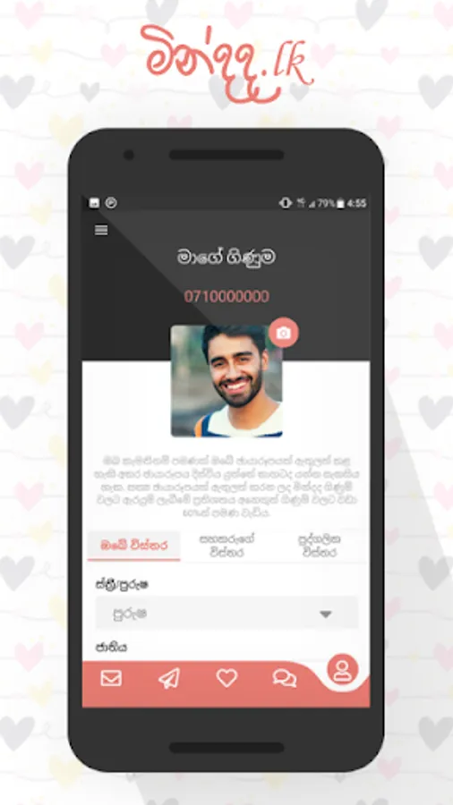 නොමිලයේ ලබාදෙන මින්දද මංගල සේවය හරහා ඔබට වයසින්, කුලයෙන්, ආගමෙන්, ජාතියෙන්, අධ්යාපන මට්ටමෙන්, රැකියාවෙන්, අදායම් මට්ටමෙන් ඇතුළු තවත් බොහෝ අංශවලින් ගැලපෙන සහකරුවෙක්/සහකාරියක් ඔබට සොයාදීමට කටයුතු කරනවා.
