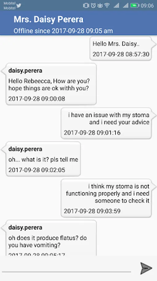 Stoma Care Application is a platform for communication between medical consultants, stoma nurses and patients, both on an individual and country-wide basis. It is also a platform for patient education and training in stoma care, serves as a billboard for notification of meetings and events and to educate the public about prevention of stomas by screening for large bowel Cancer. Furthermore, data obtained from such an app would provide opportunities for research in medicine and healthcare. Large bowel cancer is the fourth most common cancer as per the National Cancer Registry in Sri Lanka Screening by colonoscopy for large bowel cancer by age 45 years allows for identification and removal of the pre-cancerous polyp, thus totally preventing its occurrence in men and women.