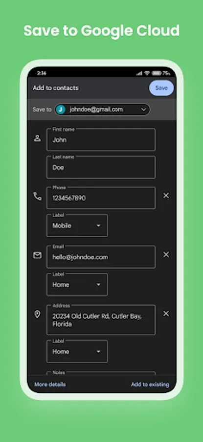 Create new contacts in your phone or Google Cloud.