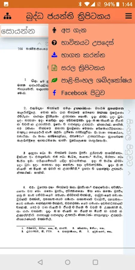 This software allows easy access to Buddha Jayanthi Tripitaka books which have been scanned. To facilitate searching, Tripitaka Books have developed a search system using tablets with 57 volumes. Contents have been used in convenient places to make it easier to read, and no other changes have been made. This makes it easy to find a formula in a printed book, without internet connection. Internet access is required to read that page.