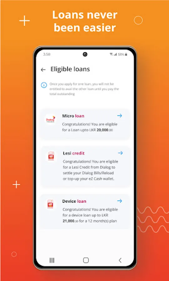 Introducing Lesi Credit - a new facility. Enjoy the feature and utilize the grant against selected Dialog Services (pay your Dialog Mobile/DTV/HBB bills etc) or top up your eZ cash wallet and repay the loan based on the stipulated monthly installments.
