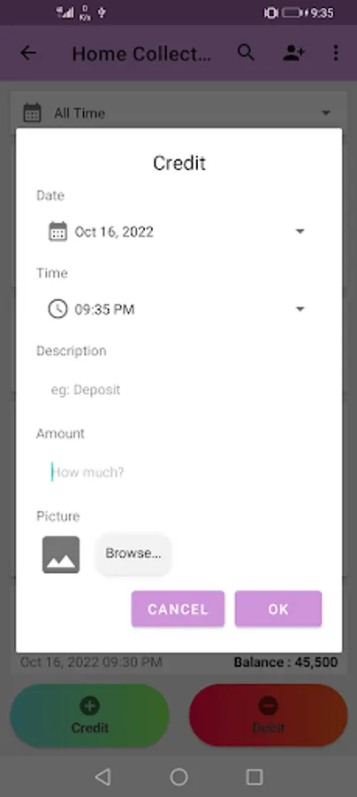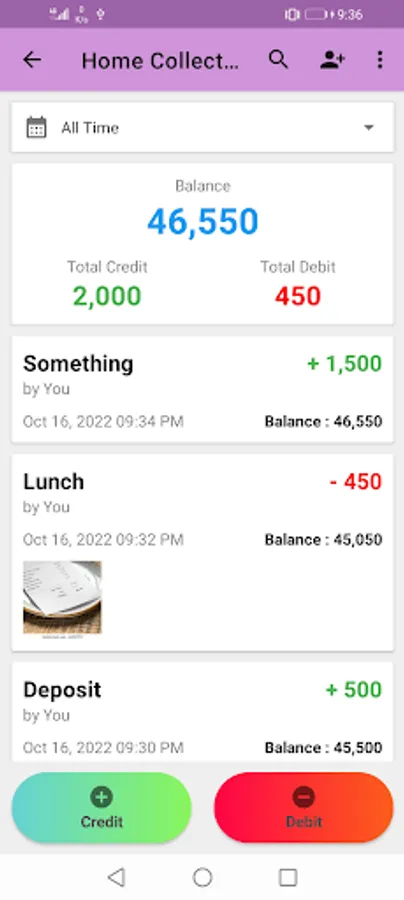 You can credit or debit any amount you want from your books. When you do a transaction you can give it a title and additionally you can attach a picture.