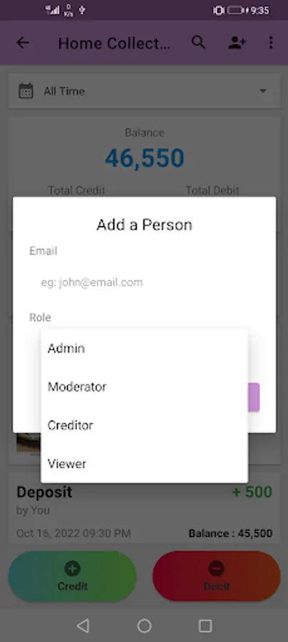 The cash book app allows you to make cash books with other members as well. You can add them to your book using their email address and you can assign them a specific role. All the transactions will get real-time updates among all the members.