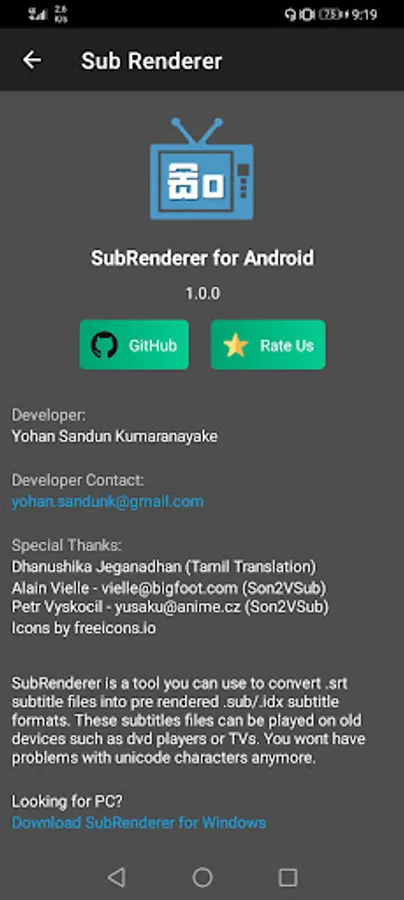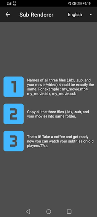 Sub Renderer for Android is the Android version of Sub Renderer software which you can find in GitHub. Sub Renderer allows you to convert .srt subtitle files into pre-rendered .idx and .sub formats. You can use these files on old TVs/Players/Computers to watch subtitles in any language without getting issues with Unicode characters.