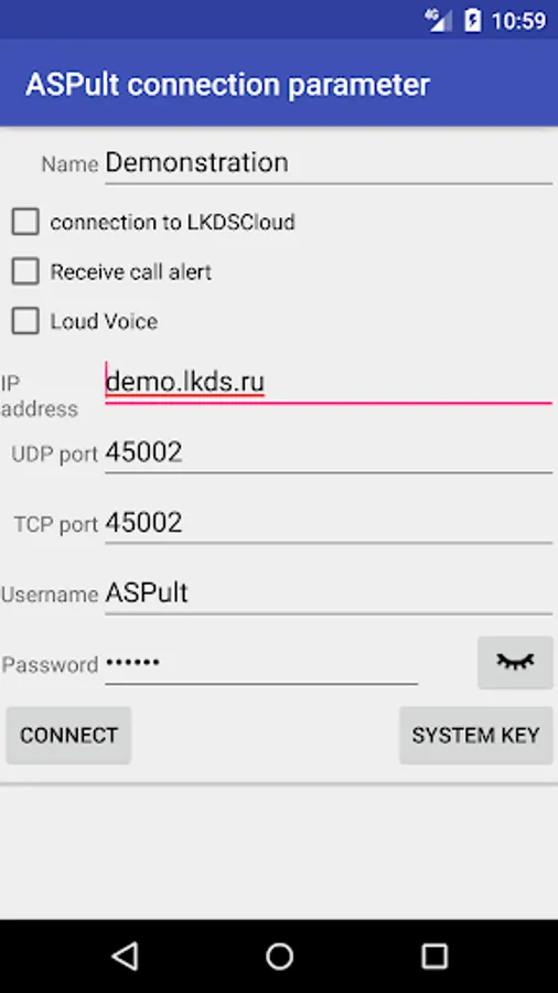 To establish this connection one can press “Demo” button, then press “Connect” button.