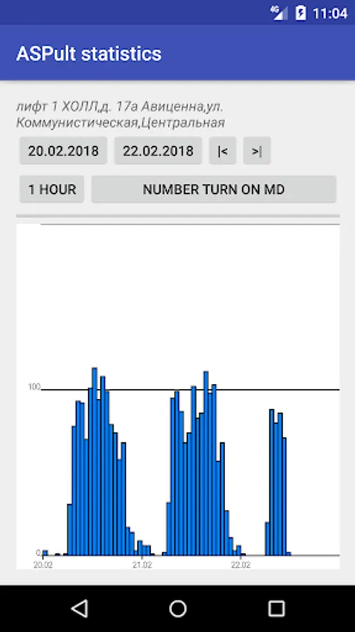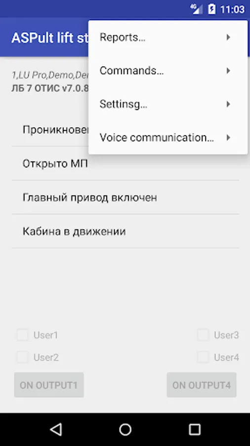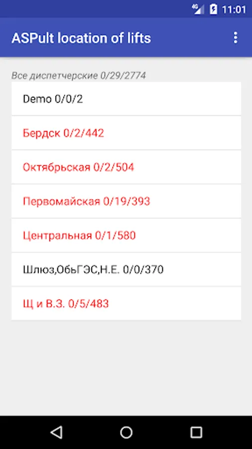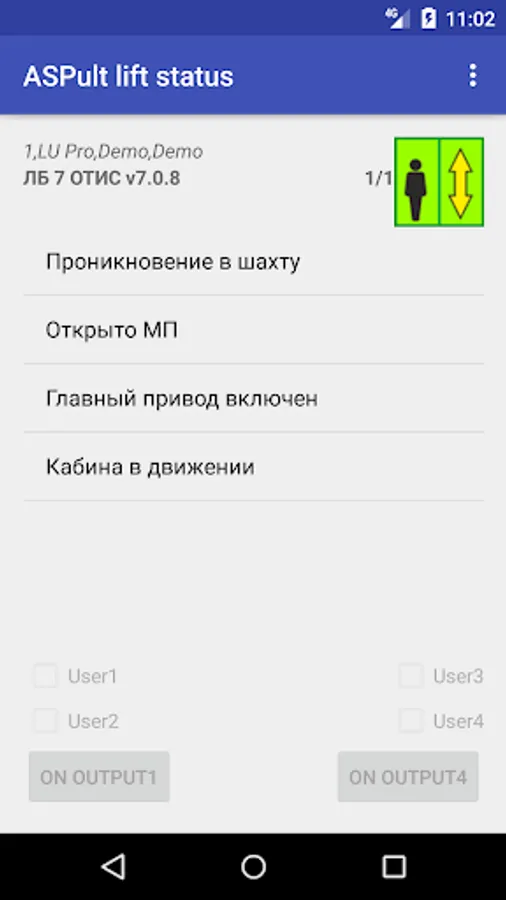 After connection established, the list of accessible lift units appear. Switching between elements of the list, expanding and collapsing the list allow you to be acquainted with different features of the application, such as: