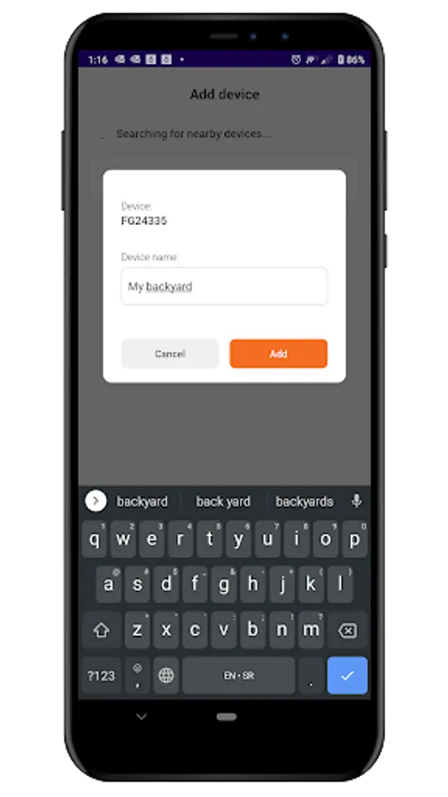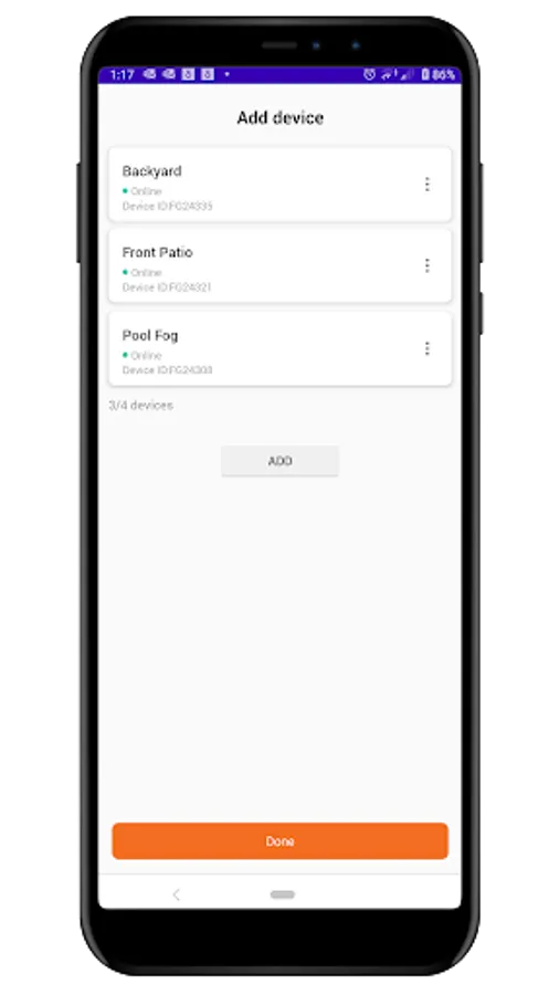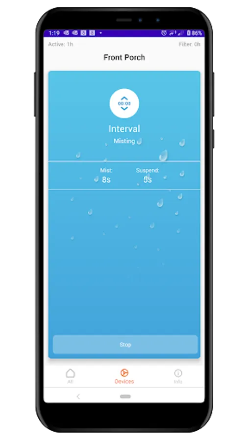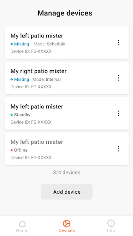 Up to 4 systems can be controlled at once. Use Add Device screen to register misters with the device. Each mister can be given a meaningful name, such as “patio mister” , “pool fog effects”, etc. Each mister can be controlled individually through “Devices” menu, or, all registered misters can be controlled with a single press of a button through Global “Home” control screen. Individual device control screen will display additional information about a mister, such as current status, cumulative running hours, and water filter hours.