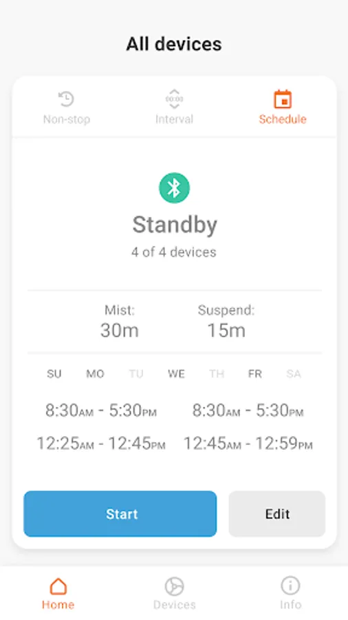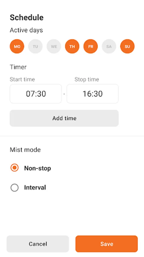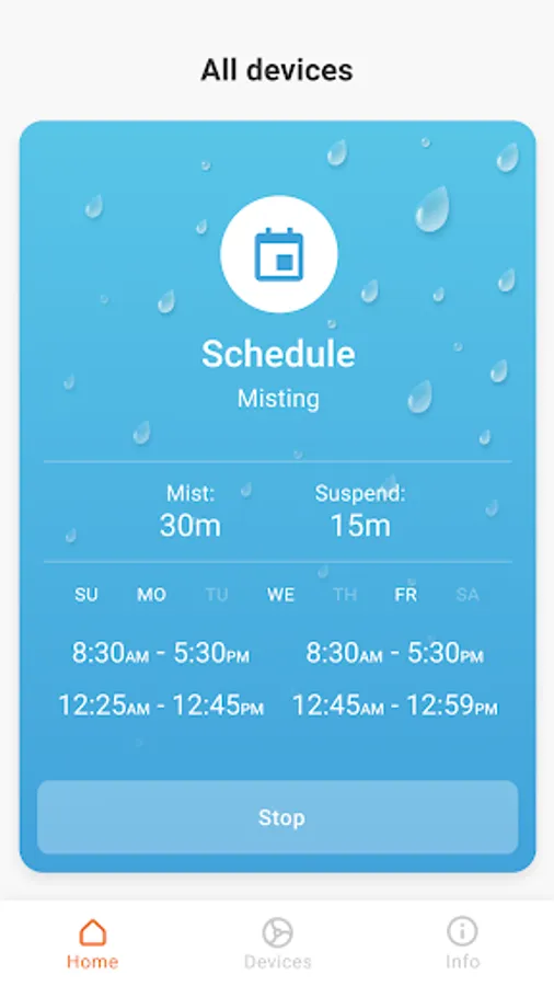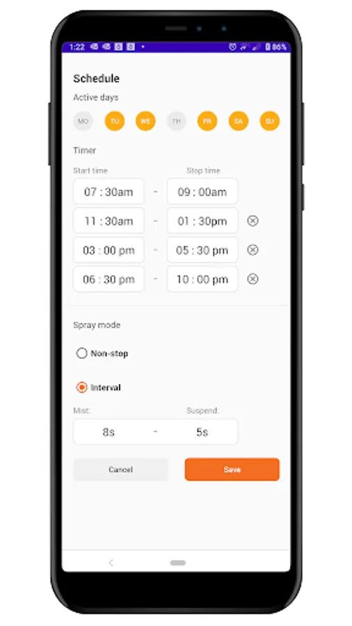 Schedule misting will allow a user to create a schedule when misting can run automatically. Schedule command is saved locally on the mister and does not require a presence of mobile device to run and keep scheduled misting. The user can select days of the week and also further refine schedule with up to 4 time intervals when misting should run. Schedule function can be set to run as non-stop or interval misting during selected days and/or time intervals.