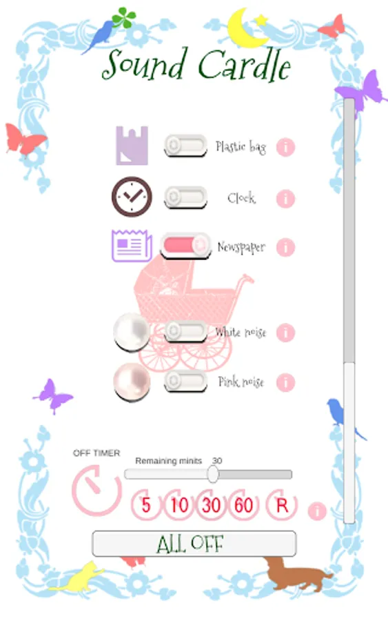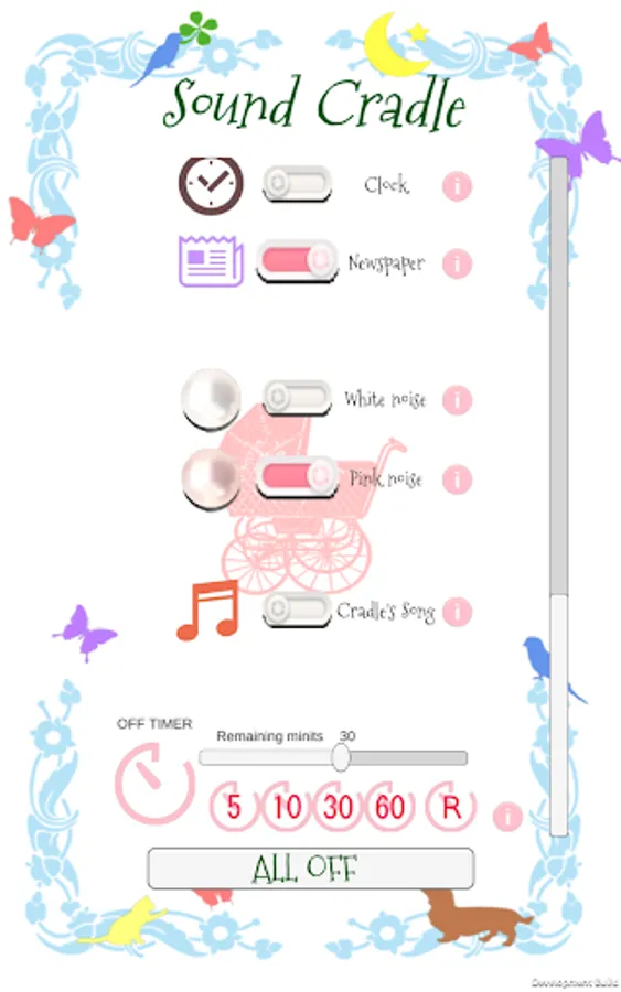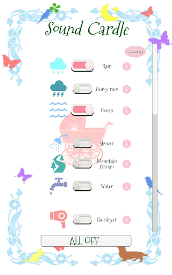 Sound Cradle brings you the widest and most versatile selection of white noise and baby sleep sounds. From ocean and rain sound, to hairdryer and water, you’ll have all the needed sounds to calm and relax your little one in a glance. Tap to turn on/off and enjoy!