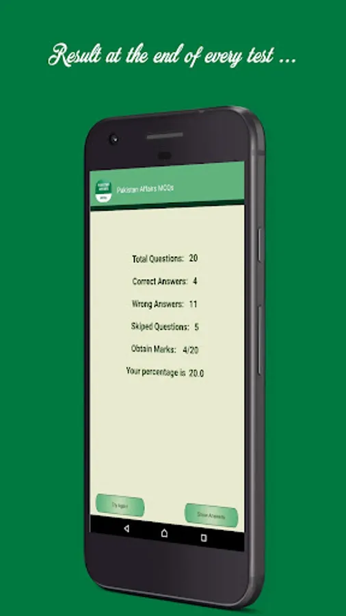 Give it a try and find out about your current preparation. After you take the test, the result will pop up with everything like your total questions attempts, correct questions, percentage and marks Obtained