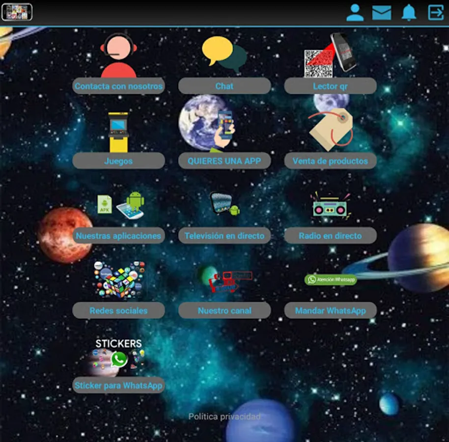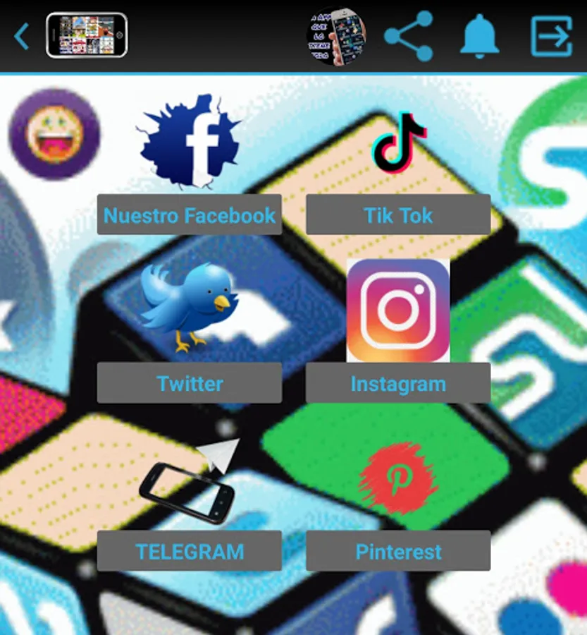 In the APP you will find in one place all social networks, live music, more than 60 national and international free television channels with chat and games, qr reader, wallpaper download, chat, sticker, access from the app to all social networks and the ability to share short videos and rate them.