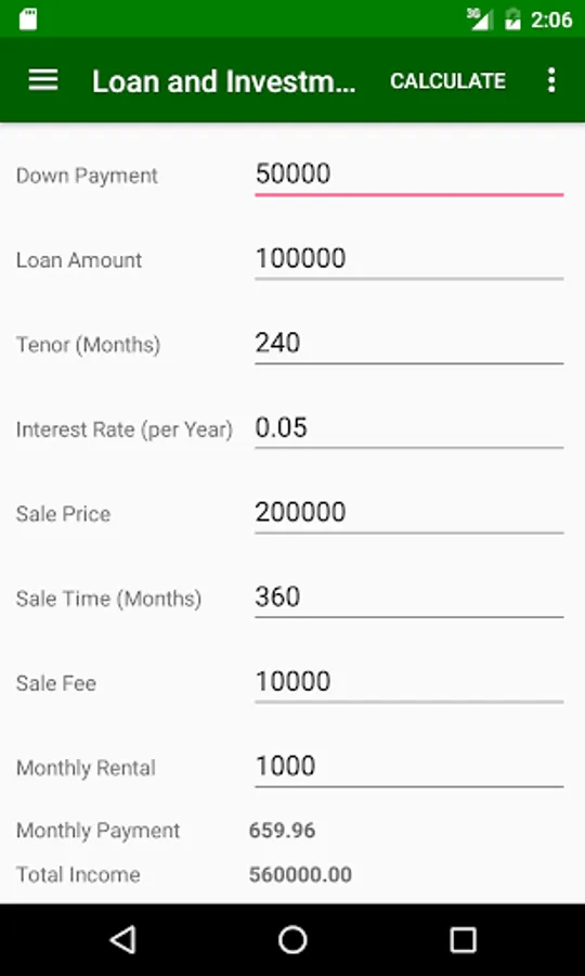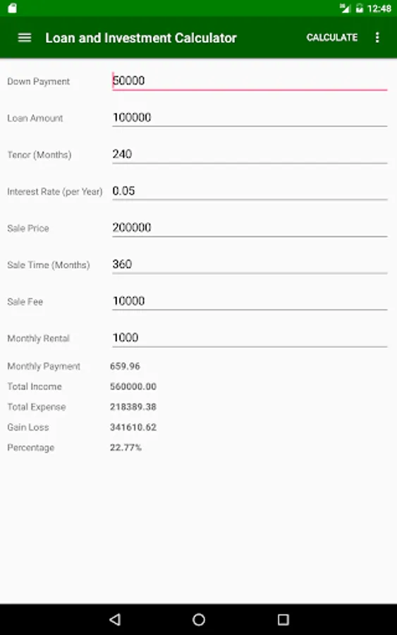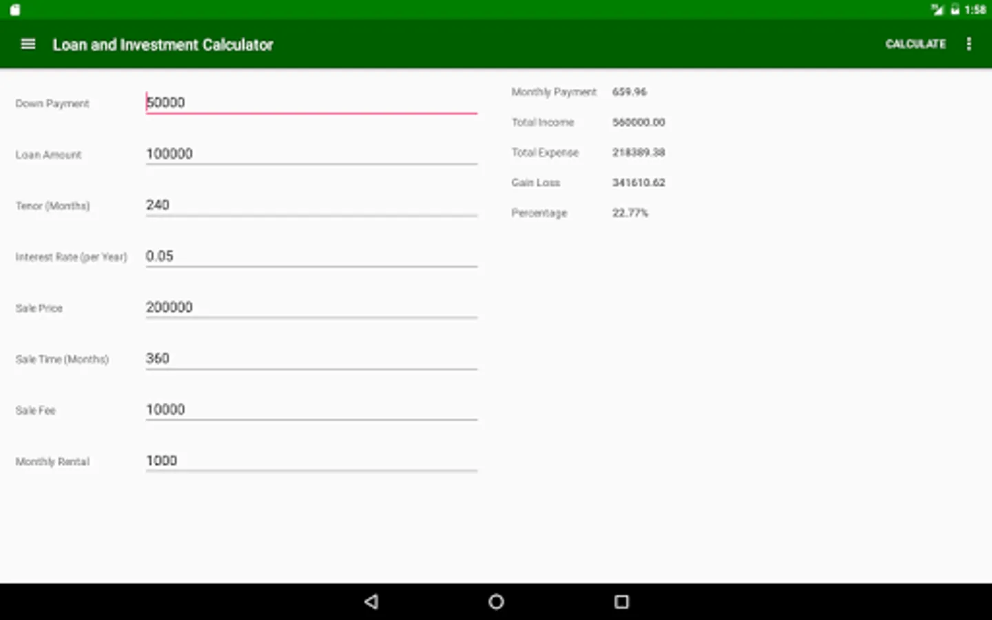 Investment gain or loss can also be calculated assuming purchase, sale price and monthly rental.