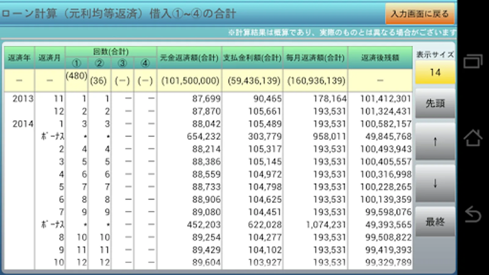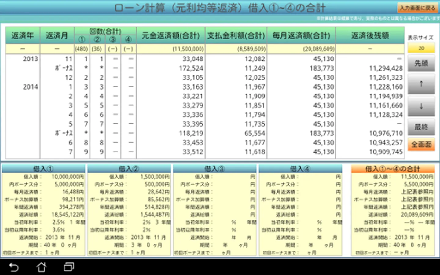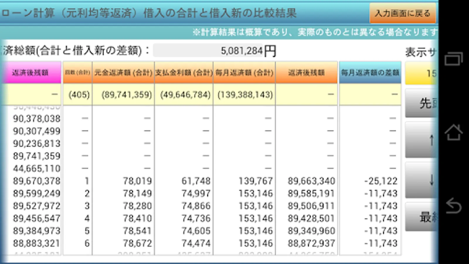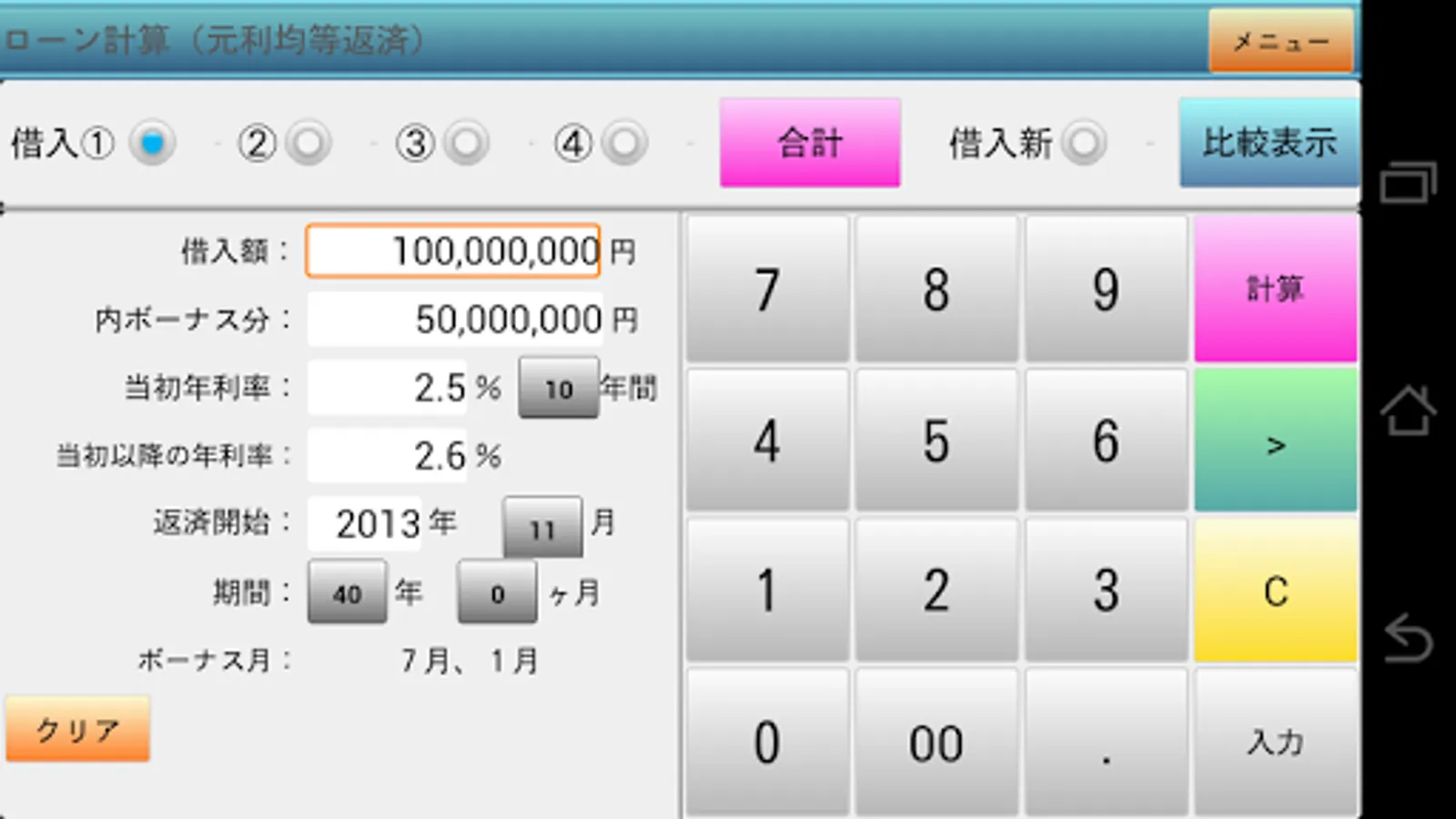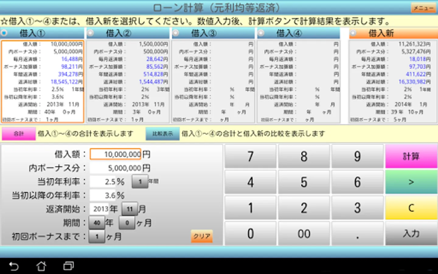 ・複数パターン(4つまで)の入力に対応し、入力した借入の合計と、新しい借入の比較が可能