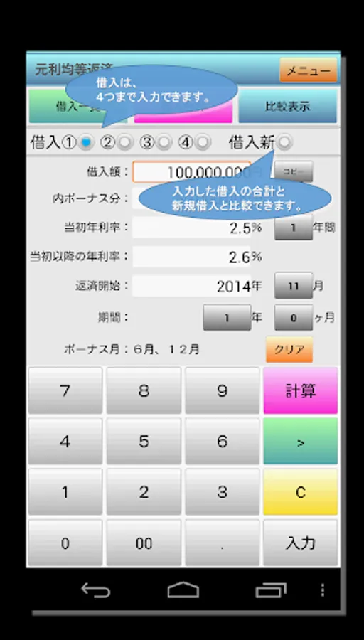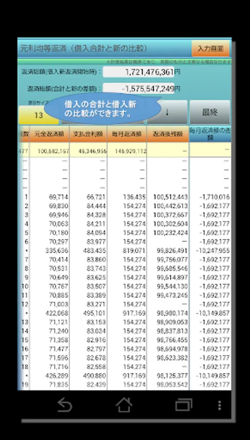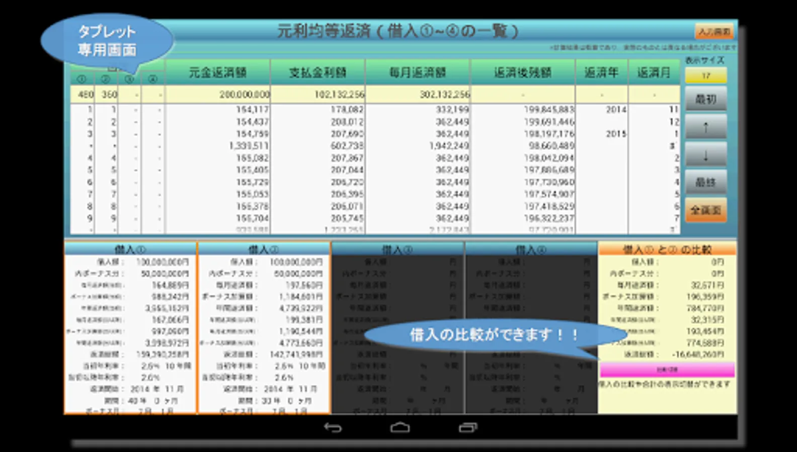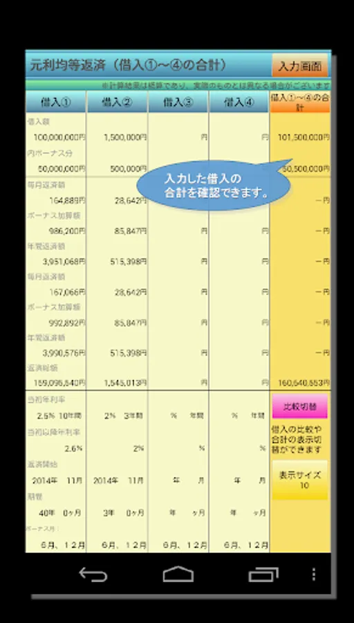 ・入力した借入を一覧で表示、借入の比較と合計表示が可能