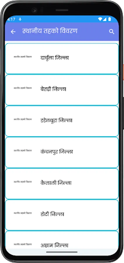 2.Local Level Information: Users can tap on individual local levels, districts, municipalities, and wards on the map to access detailed information about each administrative unit. This includes the name, boundaries, population, local government contact details, and other relevant data. The app provides an overview of the administrative hierarchy, enabling users to understand the local governance structure.