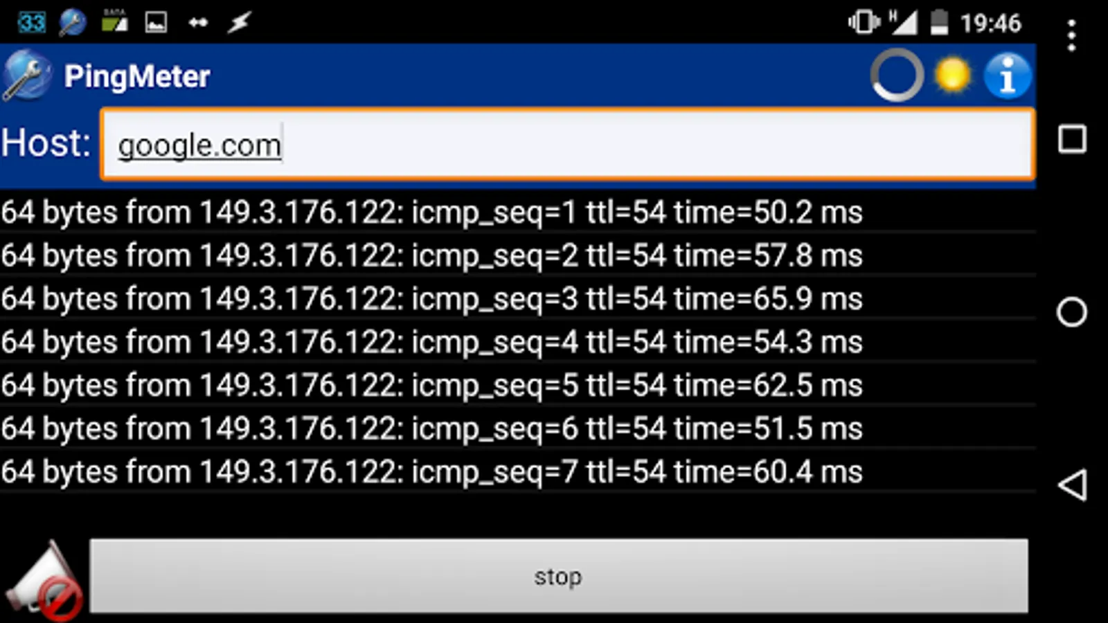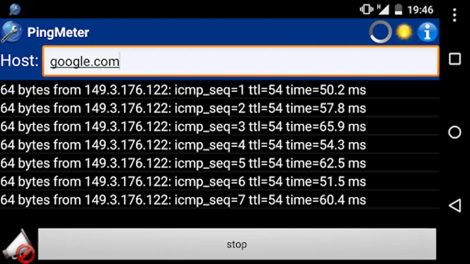 NOTE: PingMeter depends on ping command on your phone, this must be executable to allow PingMeter to run. Usually there is no problem, no user action is required, but some vendor (or Android release) could disable ping to normal user (non-root). This is not due to PingMeter and it can't resolve the limitation, sorry.