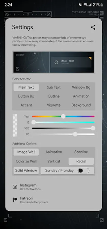This preset uses 2 home screens. The right screen is the settings panel. I did this so you could slide back and fourth when making changes to see the results in real time as you're customizing