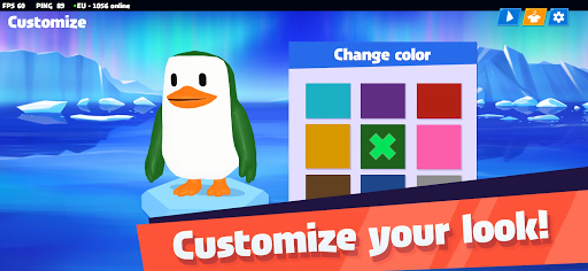 -You can choose between twelve different colors to customize the skin of your penguin. You decide the design and how you want your friends and other online players see you in the online multiplayer game of penguins