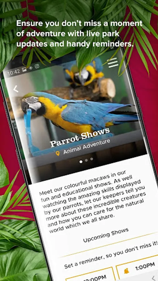 - Don't miss a moment. Partial to our Parrot Show? Eager to enjoy our Safari Bus tour? Hit ‘Up Next’ to see what’s happening at the park throughout the day and even set yourself helpful reminders.