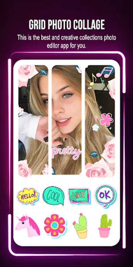 Feel free with grid photo collage 2019 to beautify your photos with a cool range of funny and adorable stickers such as: dog face stickers , Cat face stickers ,Heart crown stickers , impressive Flower crown stickers , also with collage camera you can add stylish sunglass stickers , and a lot of illustrative motion stickers.