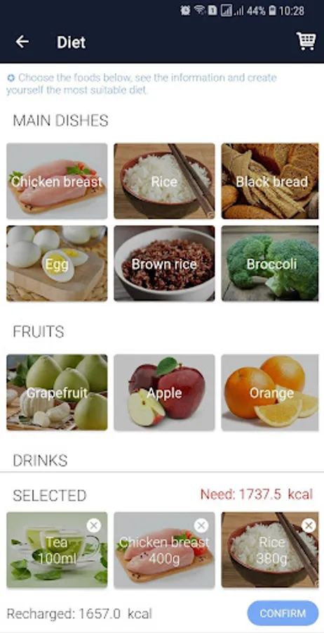 ✓ Make a list of healthy foods for your weight loss needs. Give information about the food. Calculate