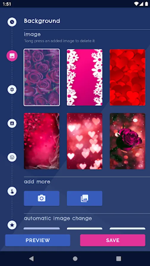 You can choose one of our many HD backgrounds or you can add your own pictures to the best love analog clock! You can set up an automatic background changer with magic touch for the love analog clock wallpapers!