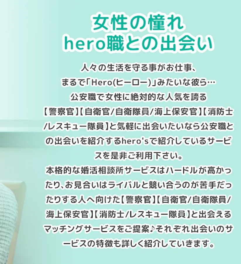 Their job is to protect people's lives, like "Hero" ... They are absolutely popular with women in public security positions [Police officers] [Self-Defense Forces / Self-Defense Forces / Coast Guard Officers] [Firefighters] / If you want to meet with rescue workers casually, please use the service introduced by hero's, which introduces encounters with public safety officers. Full-scale marriage hunting counseling service is for people who have high hurdles or who are not good at competing with rivals [Police officer] [Self-Defense Forces / Self-Defense Forces / Coast Guard Officer] [Firefighter / Rescue We propose a matching service where you can meet [members] ♪ We will also introduce the features of each encounter service in detail.