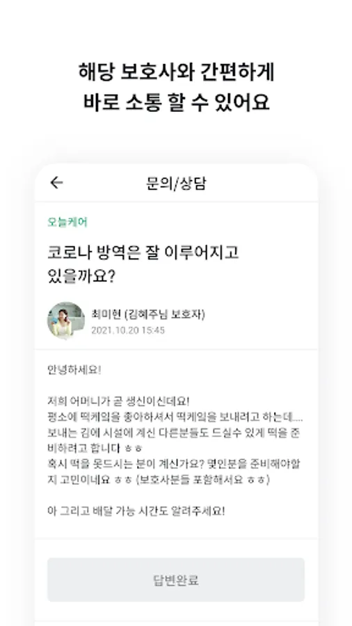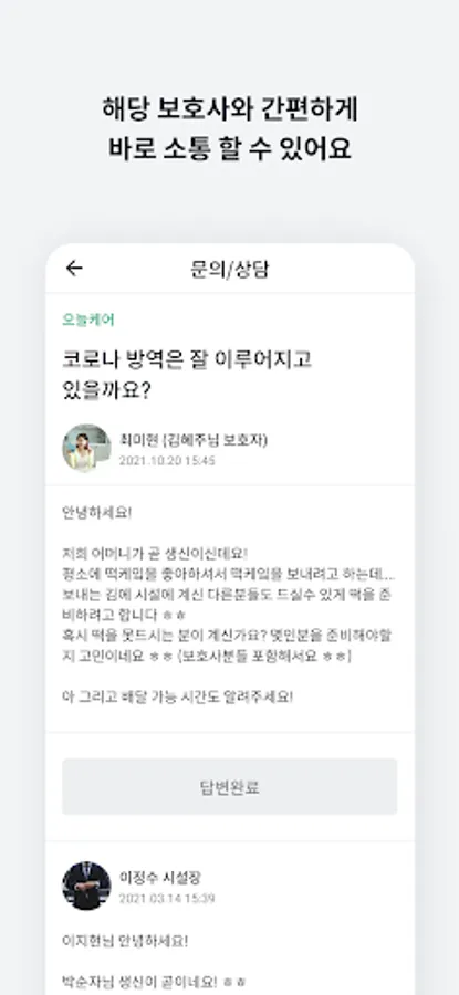 - If phone or face-to-face consultation is difficult, how about receiving a mobile consultation? Guardians can easily make inquiries via mobile, and nursing homes/day and night protection centers can check and answer guardians' inquiries in real time, anytime, anywhere with a single device.