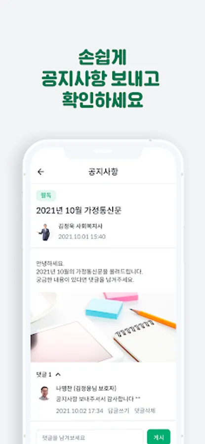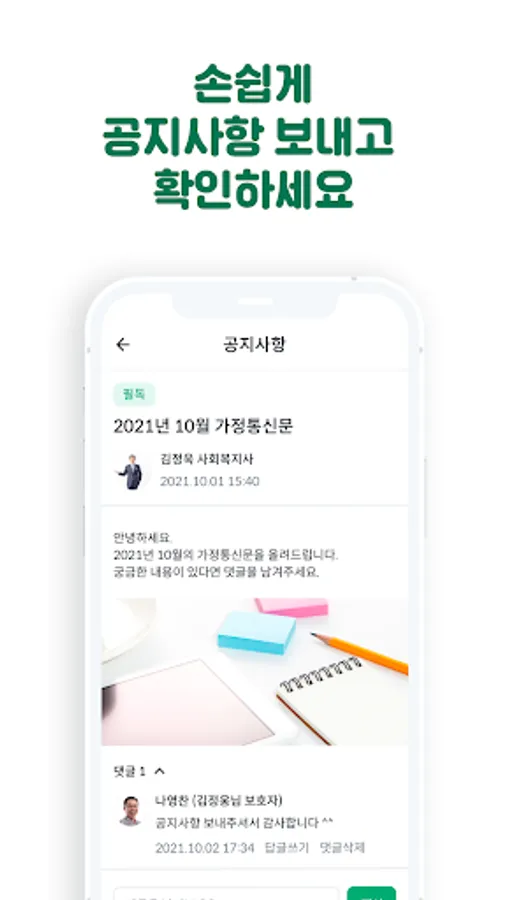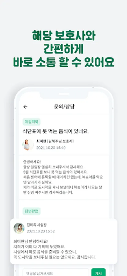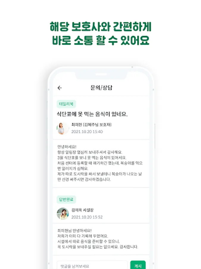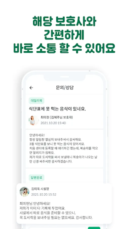 - If phone or face-to-face consultation is difficult, how about receiving a mobile consultation? Guardians can easily make inquiries through mobile, and nursing homes/day and night protection centers can check and answer guardians' inquiries in real time, anytime, anywhere with a single device.