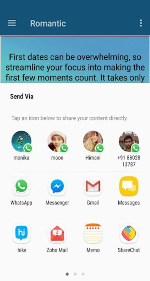 Romantic Messages is a lovely application. It contains huge collection of Special Romantic Messages. Send these romantic message to your lover to add little bit spice in your relation.