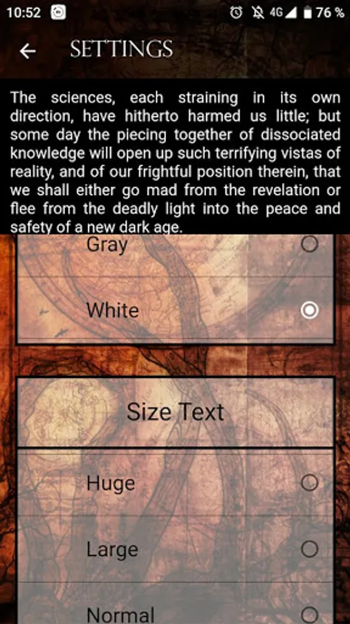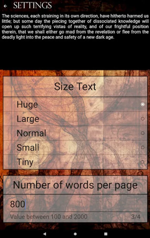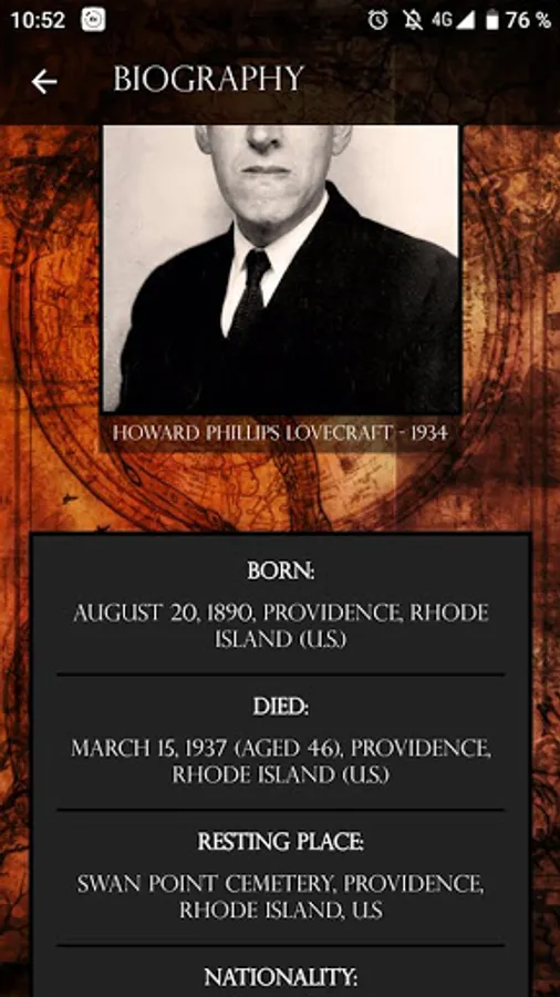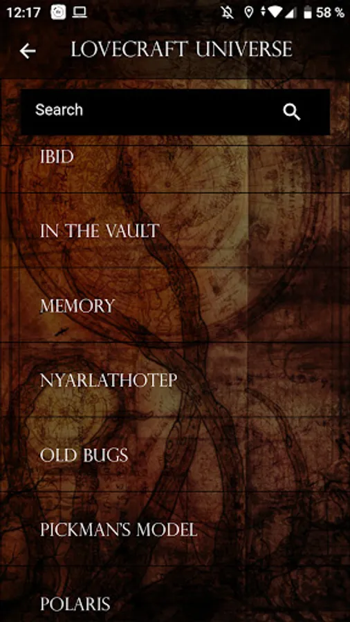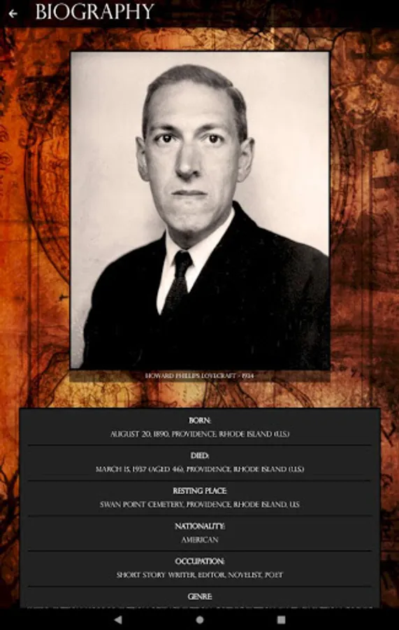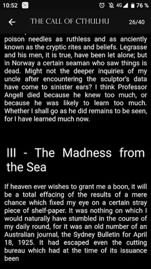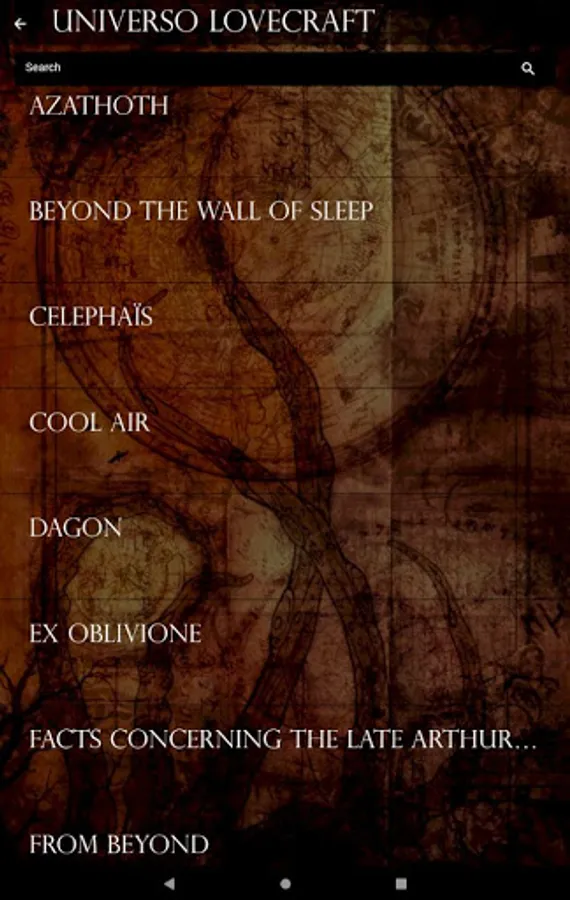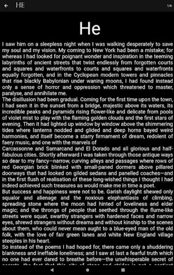In this application, you will find the stories of Lovecraft, more than 60 stories. The application has the ability to remember the last page read and the ability to change the background color, font color, and size. If you like to read short stories of cosmic horror this is your app.