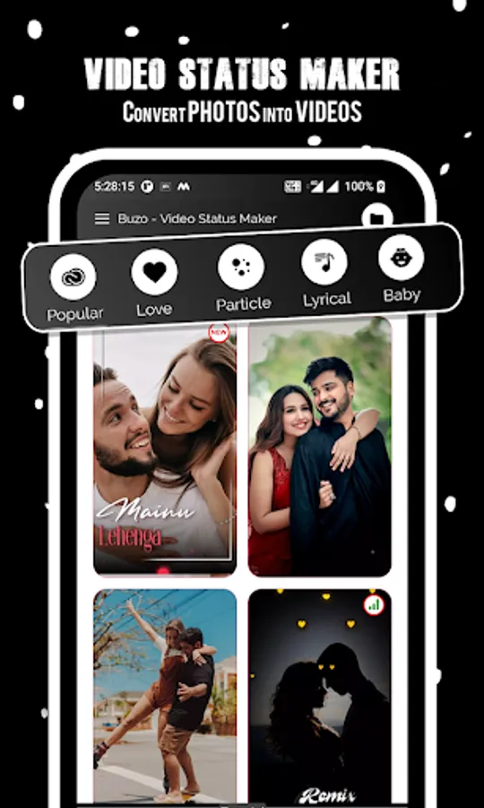 BUZO - VIDEO STATUS MAKER has thousands of video template through which you can convert your PHOTOS into awesome VIDEOS within a minute.