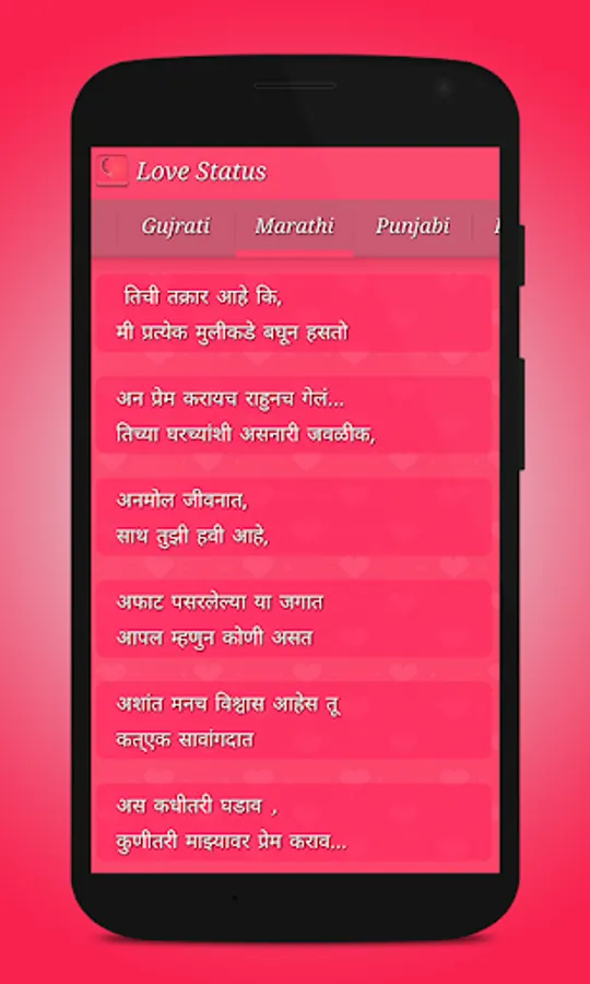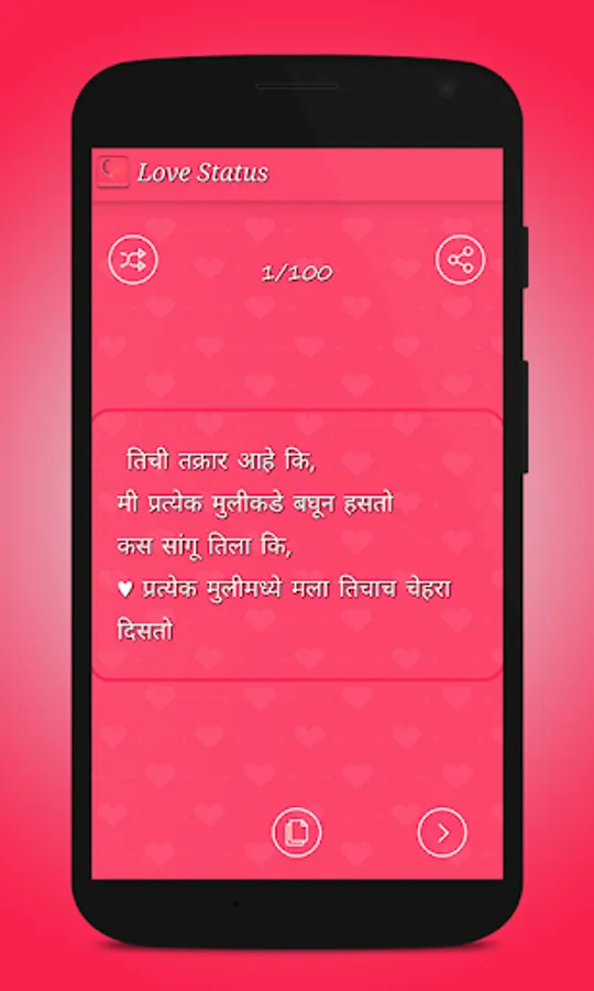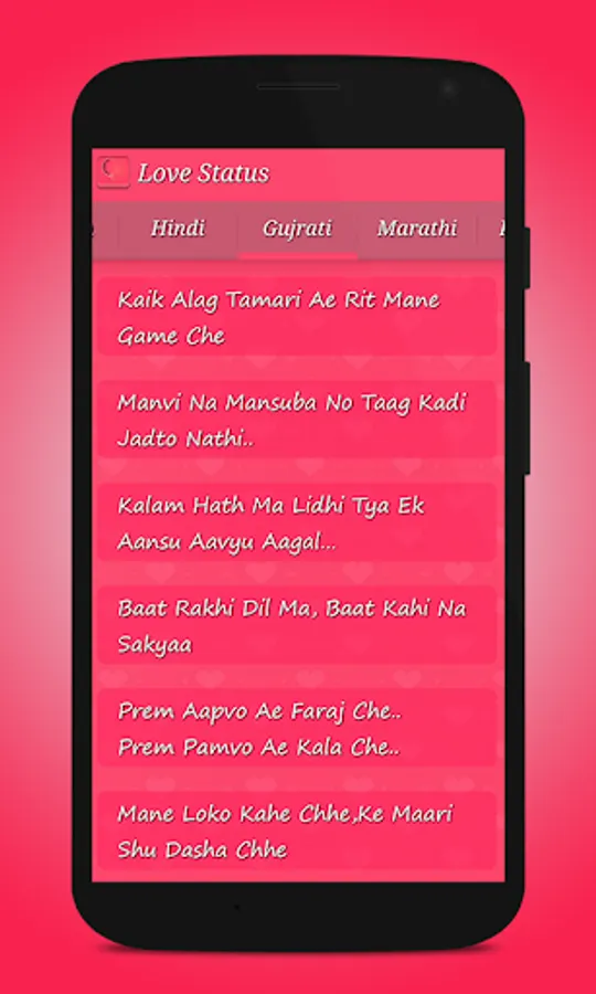 This app contains Best Love Shayari, Status and Quotes with more than 17 different categories that you never find any where else.This app contains Best and Fresh Collection of Love Status in Hindi Font and best thing is that this app works in Offline mode !
