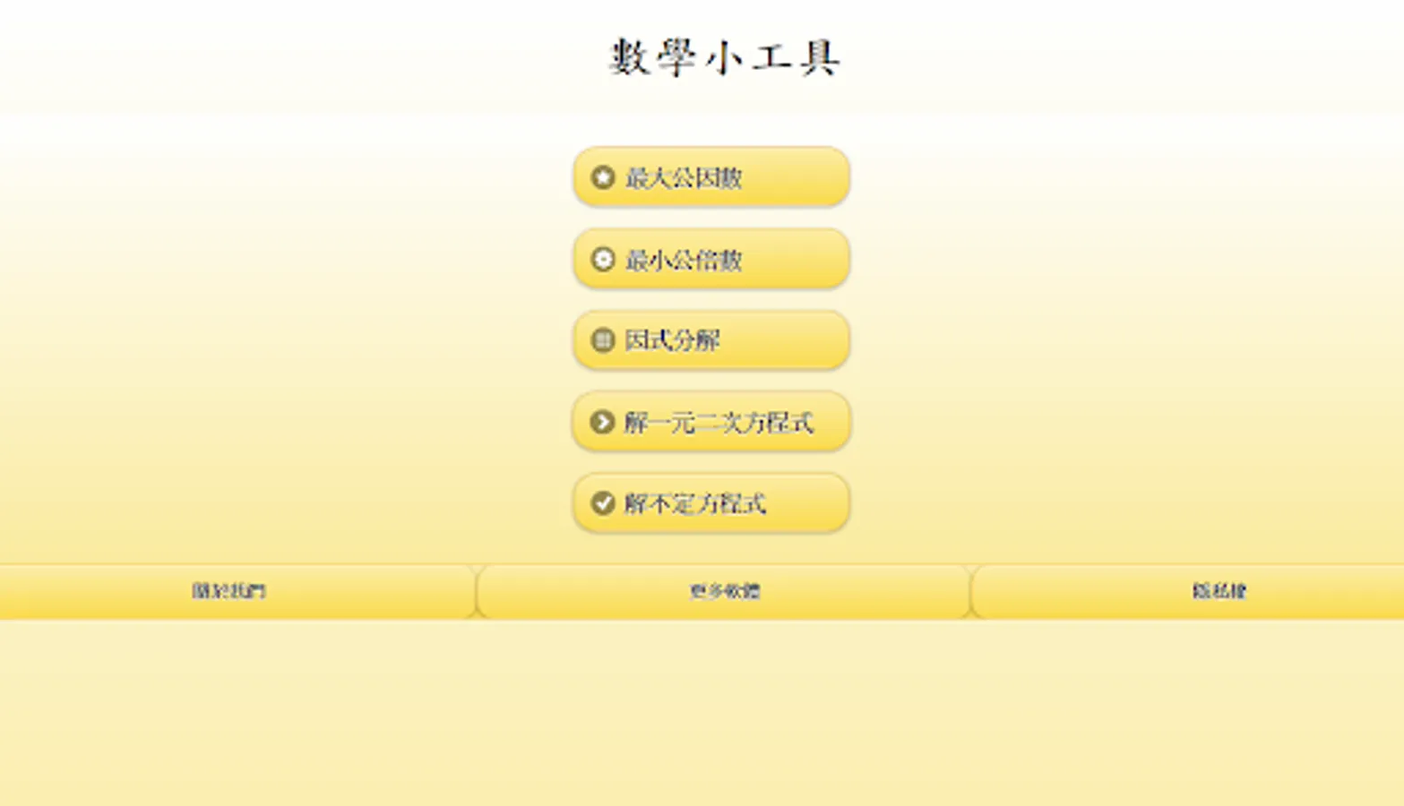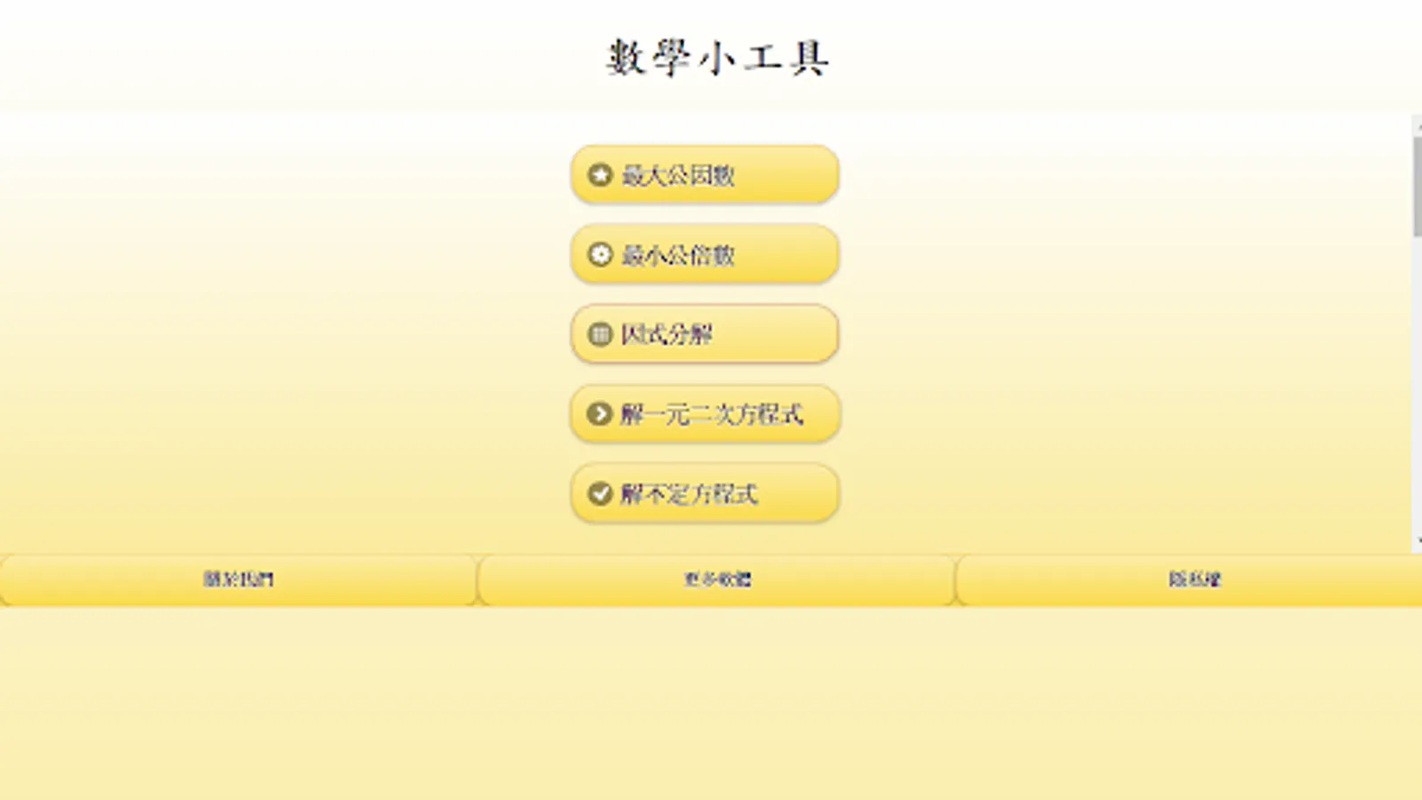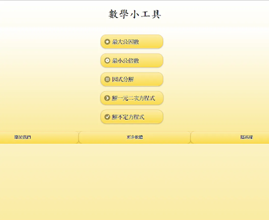 Math_tools is a math gadget for beginners and advanced students or teachers in calculating the greatest common factor, least common multiple, solving binary and ternary simultaneous equations, factorization, solving one-dimensional quadratic equations, and binary one-time or ternary one-time A good helper for indefinite equations, suitable for users who want to quickly solve the above complicated math calculations and get answers quickly.
