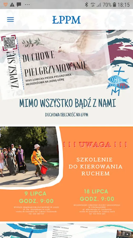 The application is an integral part of the Łowicz Youth Pilgrimage to Jasna Góra, allowing you to get acquainted with the Spiritual Program of the pilgrimage and its route. It enables the interested party to send intentions to the trail and follow the news of the current pilgrimage.