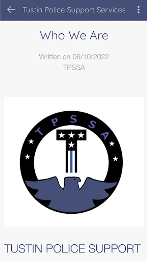 This app is intended as a communications tool for the Tustin Police Support Services Association, its members and the residents of Tustin, California. It includes: