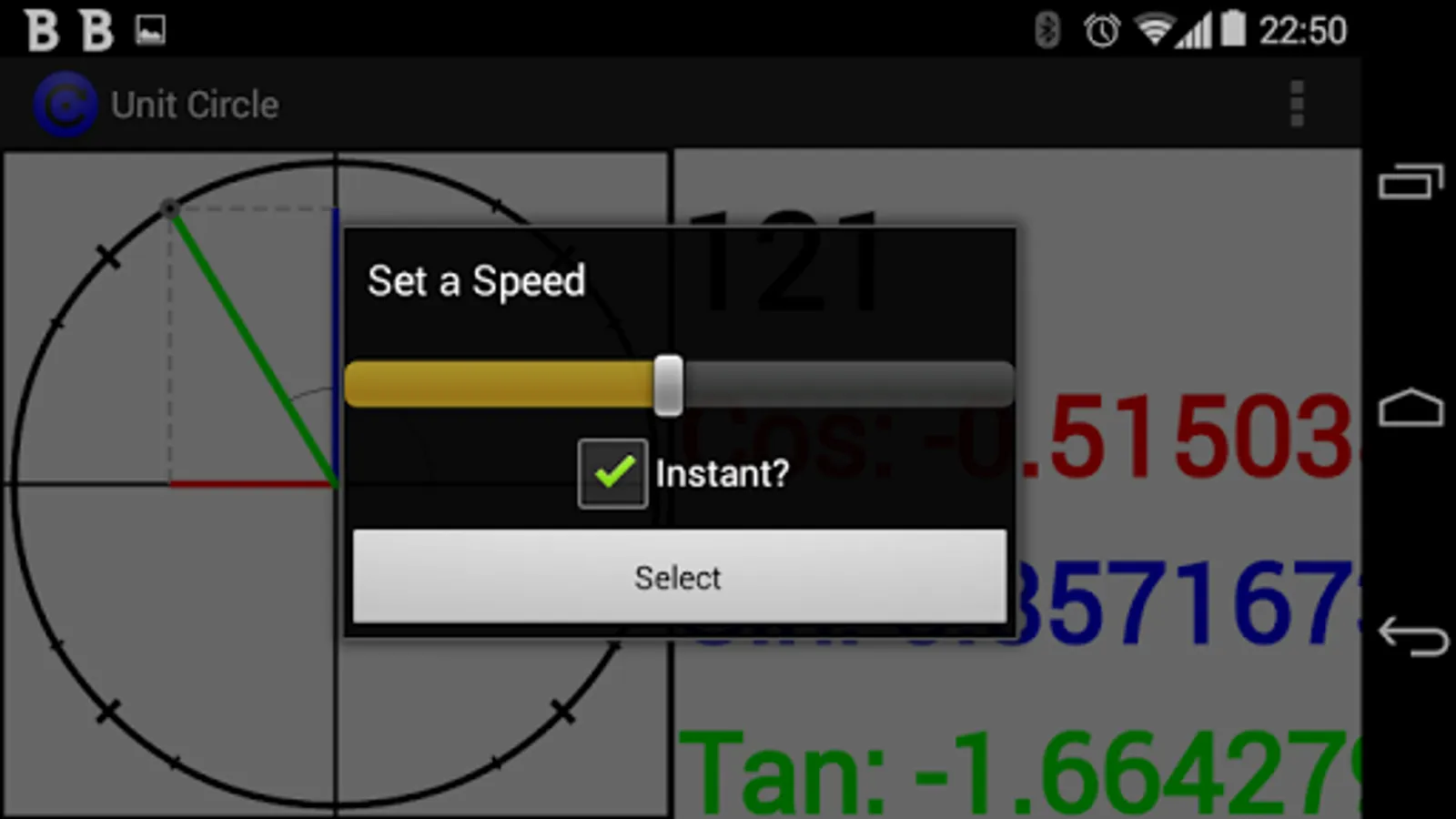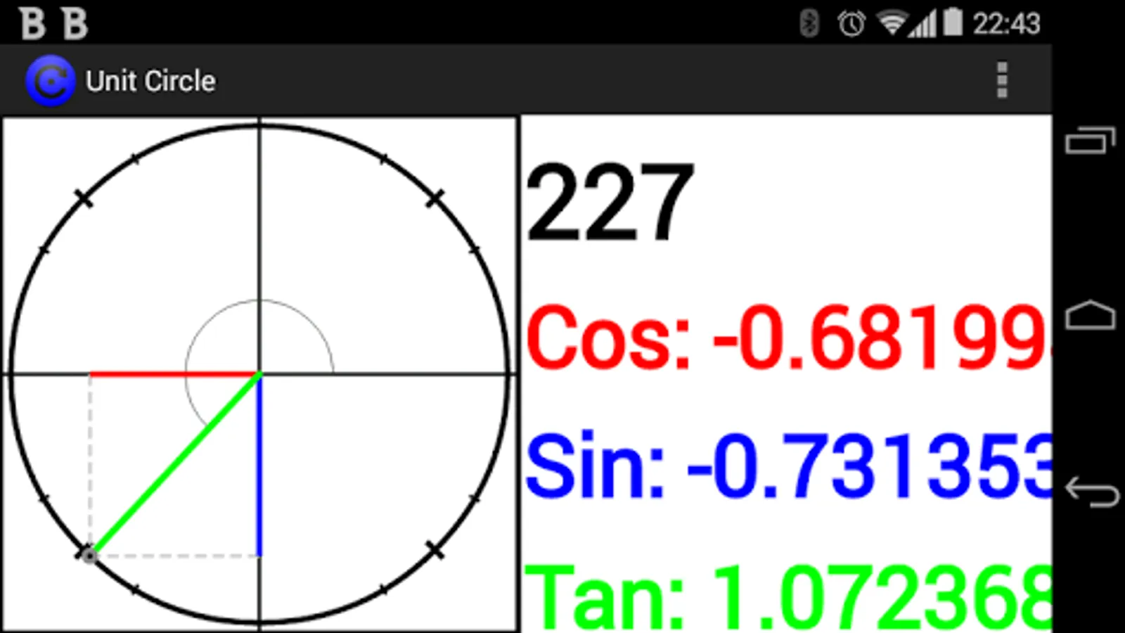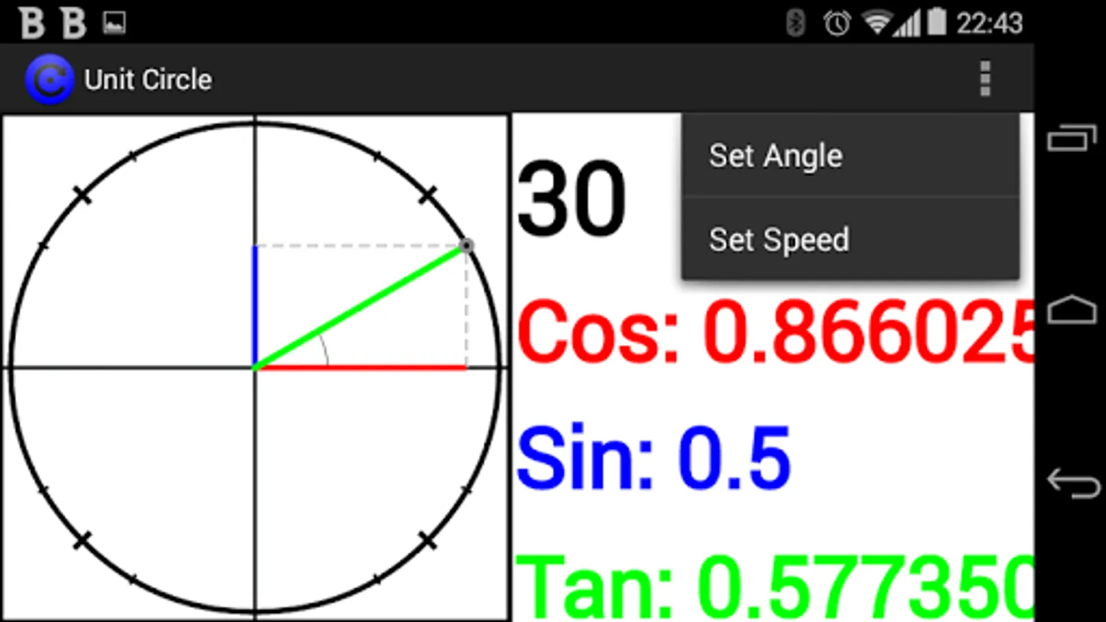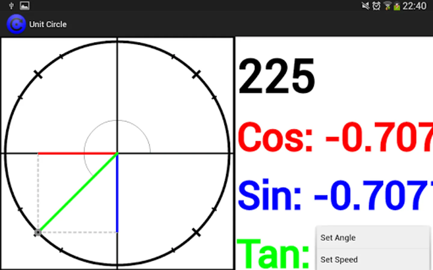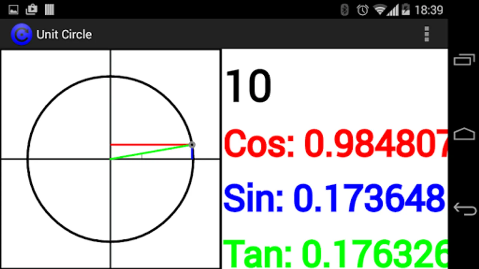 A circle with a radius of 1 in the centre of a grid, this app lets you explore trigonometry by allowing you to see the sides of a right angled triangle shrink and expand as it goes around the circle.