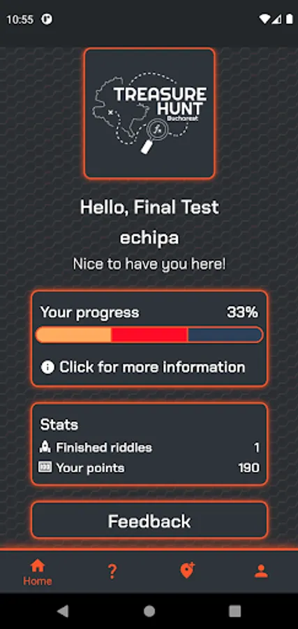 • finishing your hunting when you successfully validate all the checkpoints or when your time runs out, then hope to find your team at the top of the leaderboard!