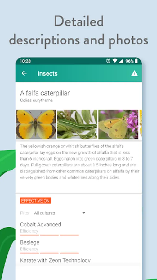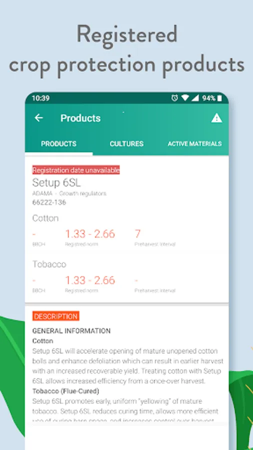 This application features a rich and continuously updated database of weed, diseases, pest and insect, also including crop protection product descriptions with links – choose the right solution to a specific problem. It also provides information about crop protection product registration and expiry date, and the most importantly - efficiency on different issues.