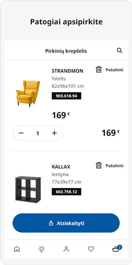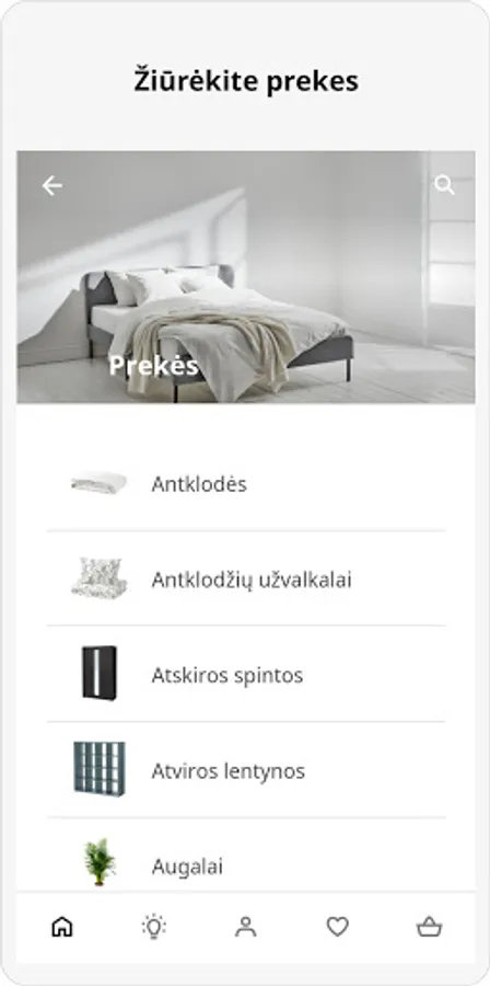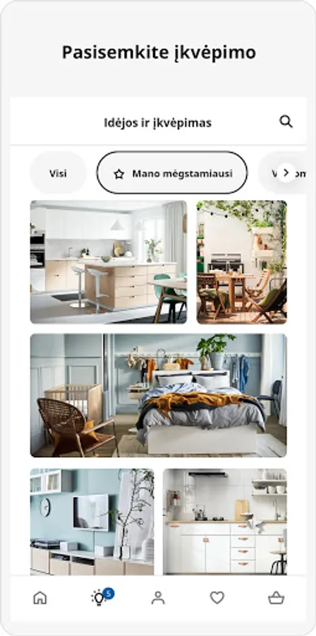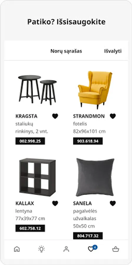 Jei radote patinkančią prekę, bet kol kas neketinate įsigyti, išsisaugokite ją norų sąraše. Tai padaryti galite bet kurioje programėlės vietoje – tiek prekių, tiek įkvėpimo puslapiuose, o taip pat – nuskaitę prekės kodą parduotuvėje.